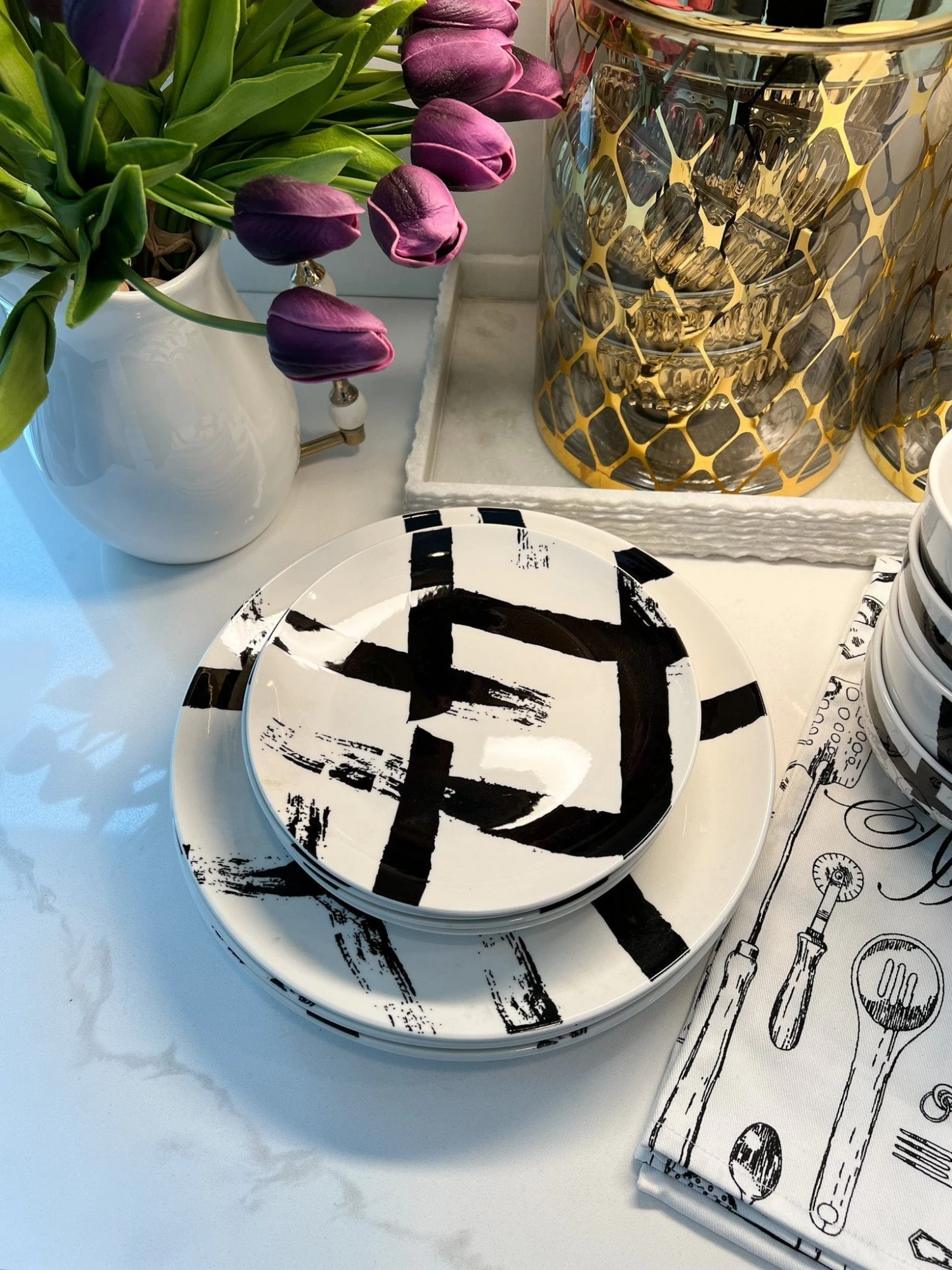 Description: This set of 12 dinnerware set has such a cool black brushstroke pattern! It is a great option to bring some texture to your table setting!