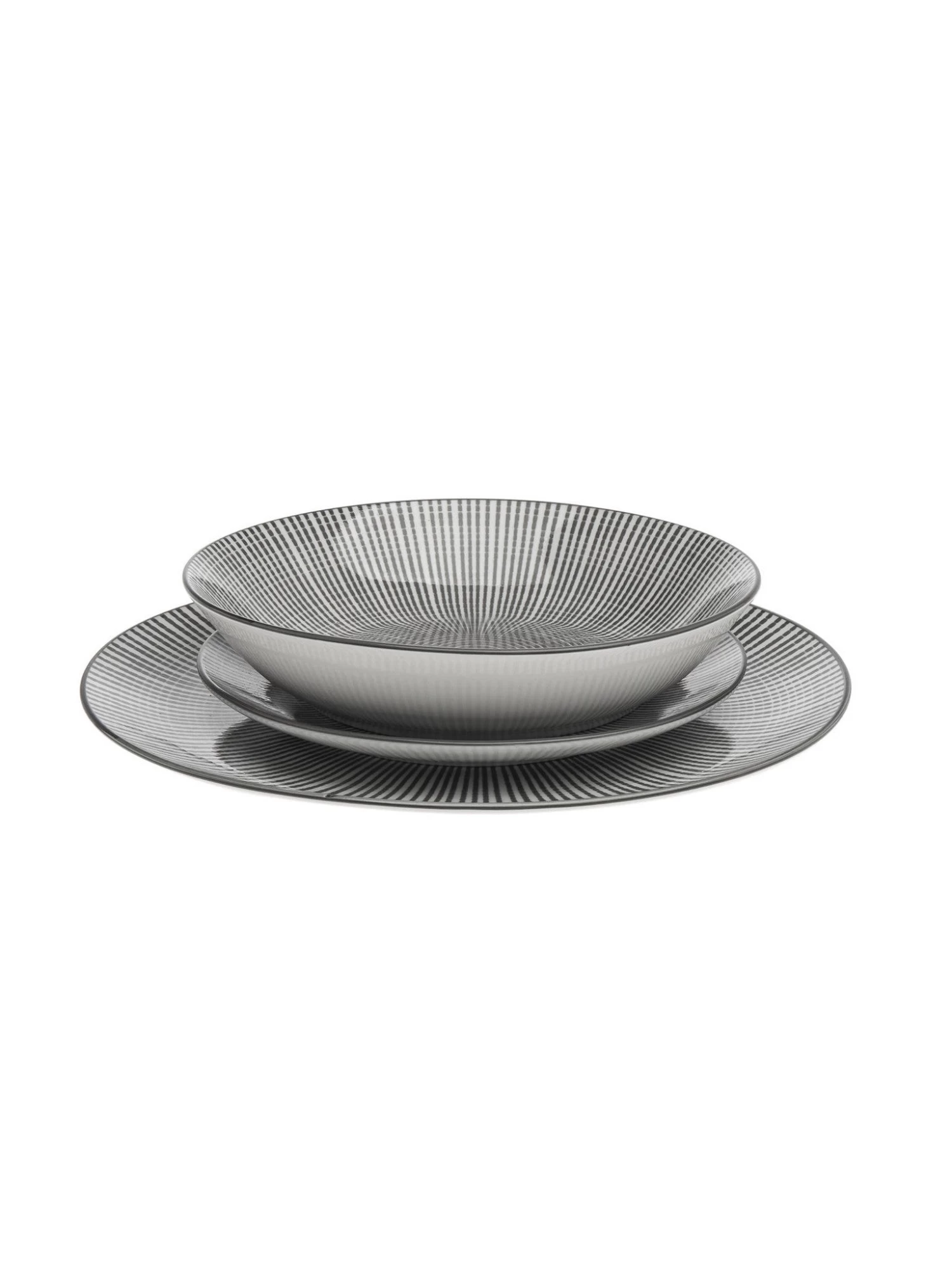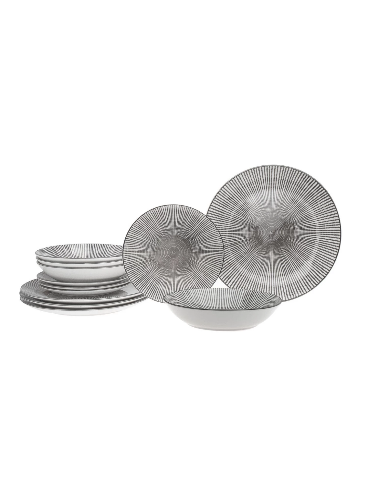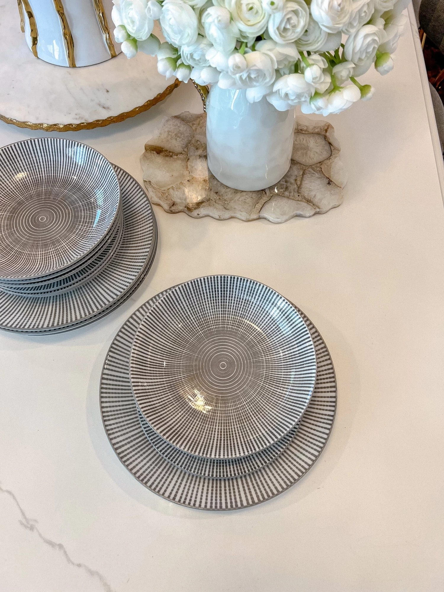 Description: This gorgeous glossy dark grey & white design dinner set features four dinner plates, four salad plates and four bowls. This is perfect for Holidays, a special dinner for two, family gatherings or just for everyday dining. This looks fits in perfectly with any decor!