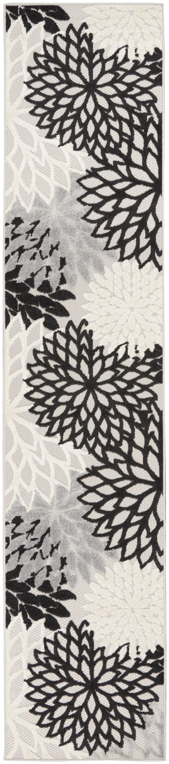 In shades of black, white and grey, this Aloha outdoor rug brings extra life and excitement to your patio, deck, or poolside. Its high-low construction combines delightful texture with an intricately woven base for an exceptional look and feel that stands up to the elements. Machine made from premium stain-resistant fibers for long wear and easy cleaning: just rinse with a hose and air dry.