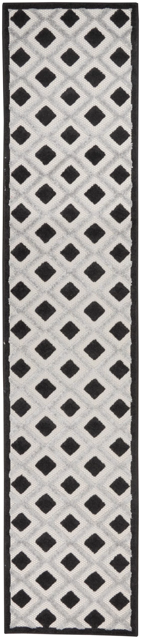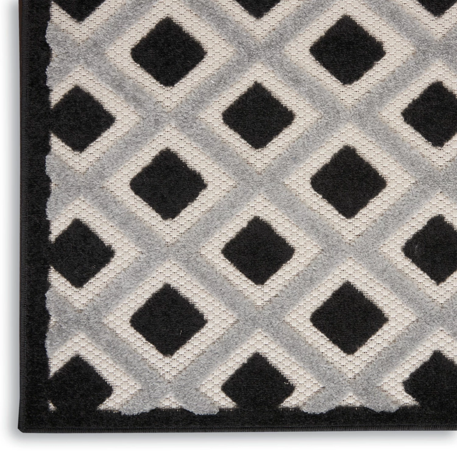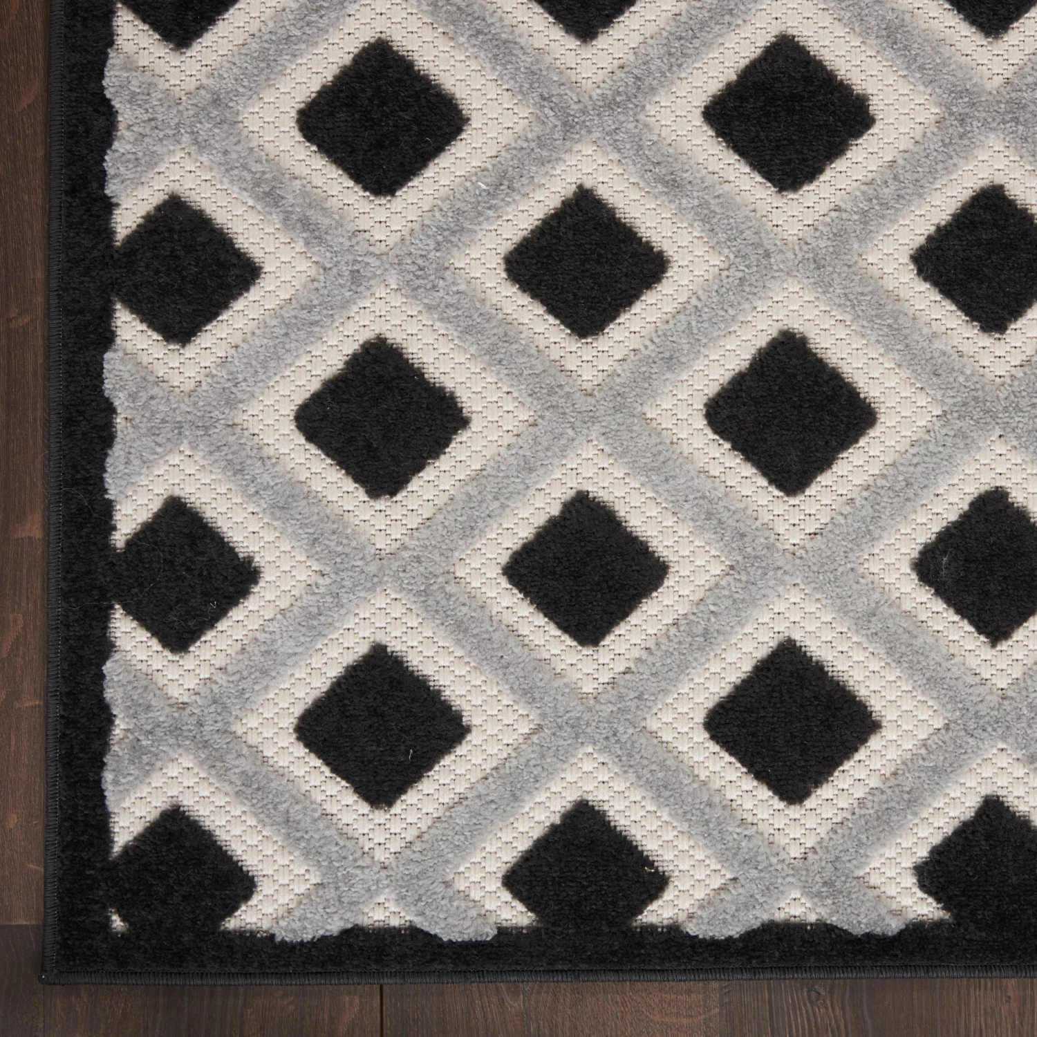 Introduce texture and pattern to your porch or deck with ease with this outdoor rug from the Aloha Collection. Simple in its sophistication, it features an all-over concentric diamond motif with a simple border in black, white, and grey tones that work beautifully in modern and contemporary settings. Premium, stain resistant fibers offer durability and ease of cleaning โ just rinse with a hose and air dry!