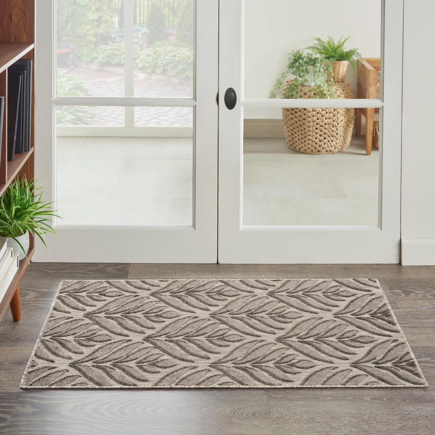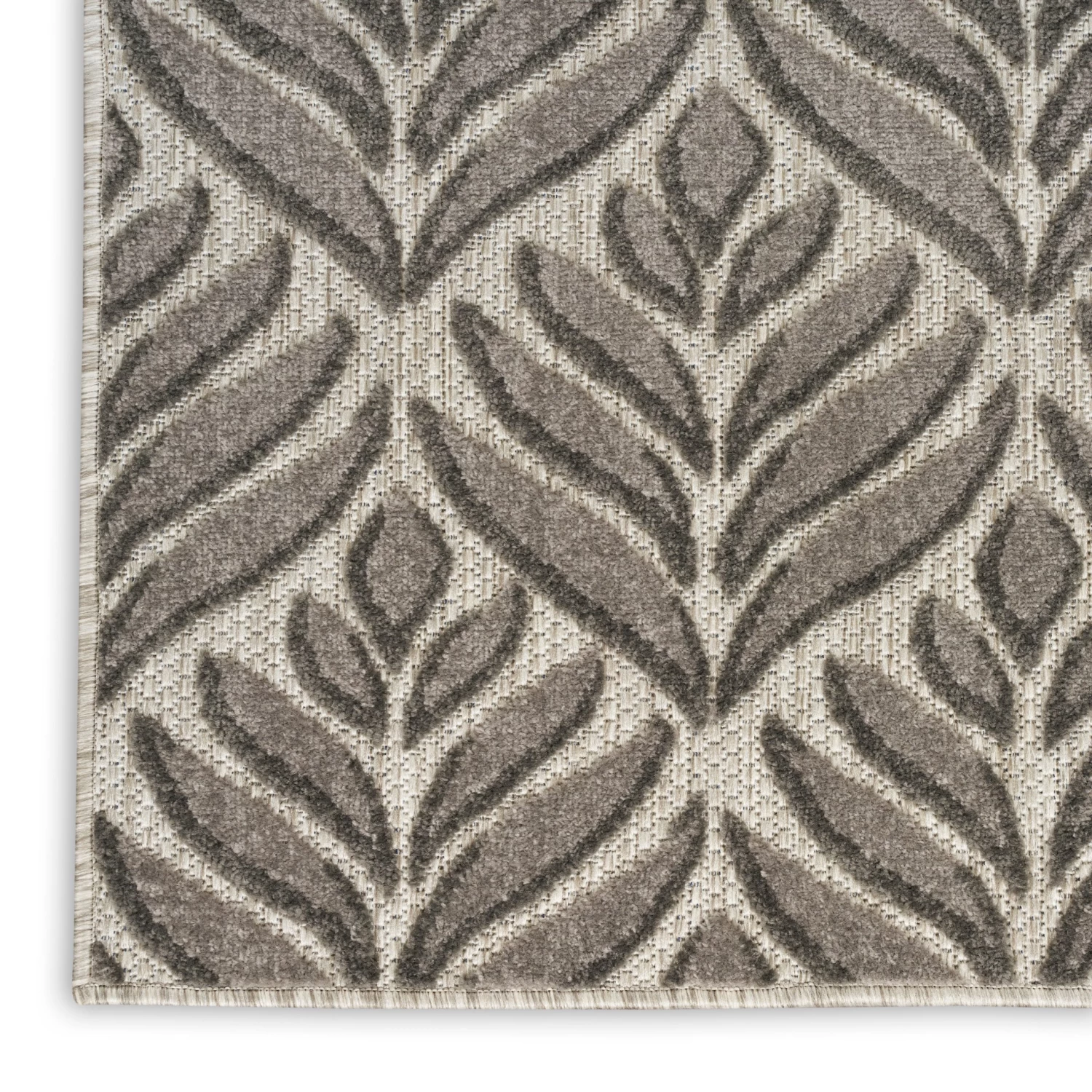 Tropical meets modern with this charcoal grey outdoor rug from the Aloha Collection. The flatwoven design is adorned with a raised, repeat palm leaf pattern that adds a subtle layer of dimension. Presented in calming colors, this botanical rug beautifully complements your patio, balcony, or deck. Made from durable polypropylene yarns that make it great for use in high-traffic indoor spaces as well, such as your kitchen, dining room, and living room.