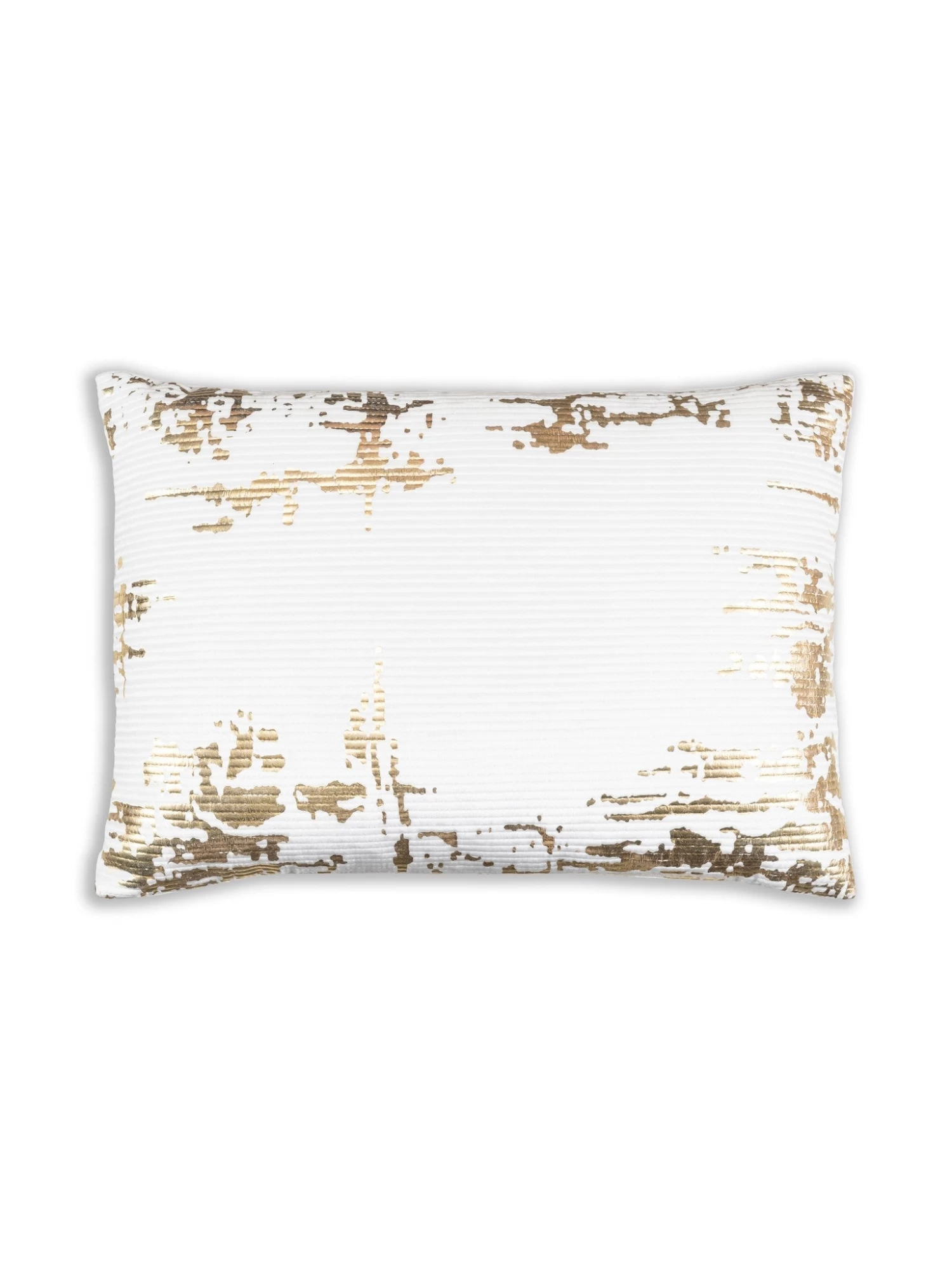 Oblong White Velvet with Quilting and shiny gold foil print pillow with knife edge.