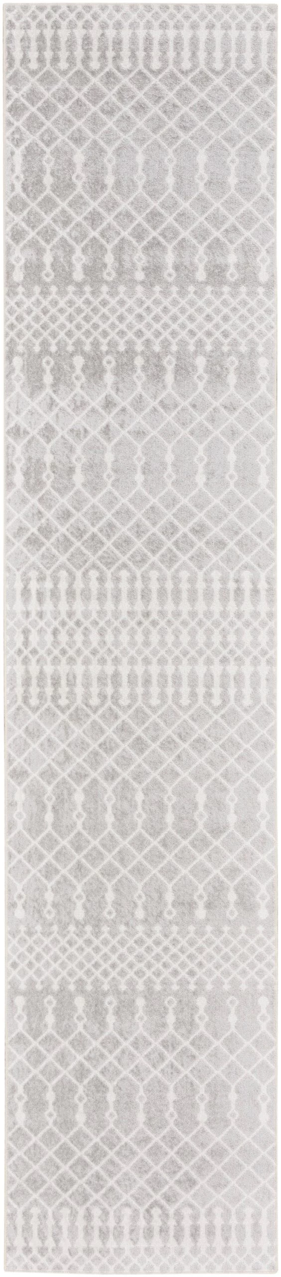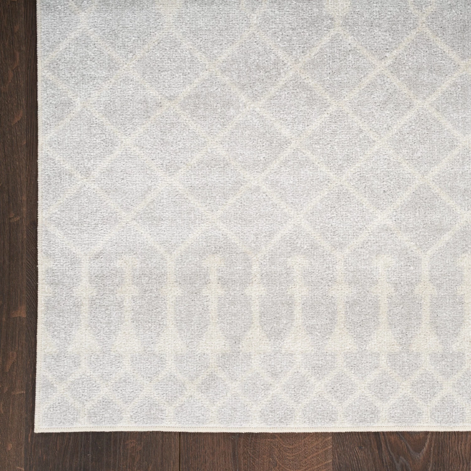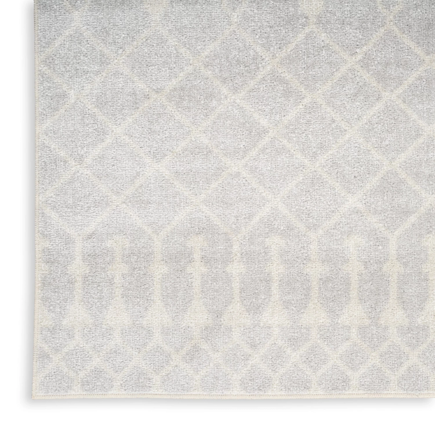 Bring global style home with this boho chic rug from the Astra Machine Washable Collection. Presented in grey and ivory, the classic Moroccan trellis pattern is finished with a vibrant sheen that shifts in tone under different light. This machine-washable rug beautifully complements modern and farmhouse décor.