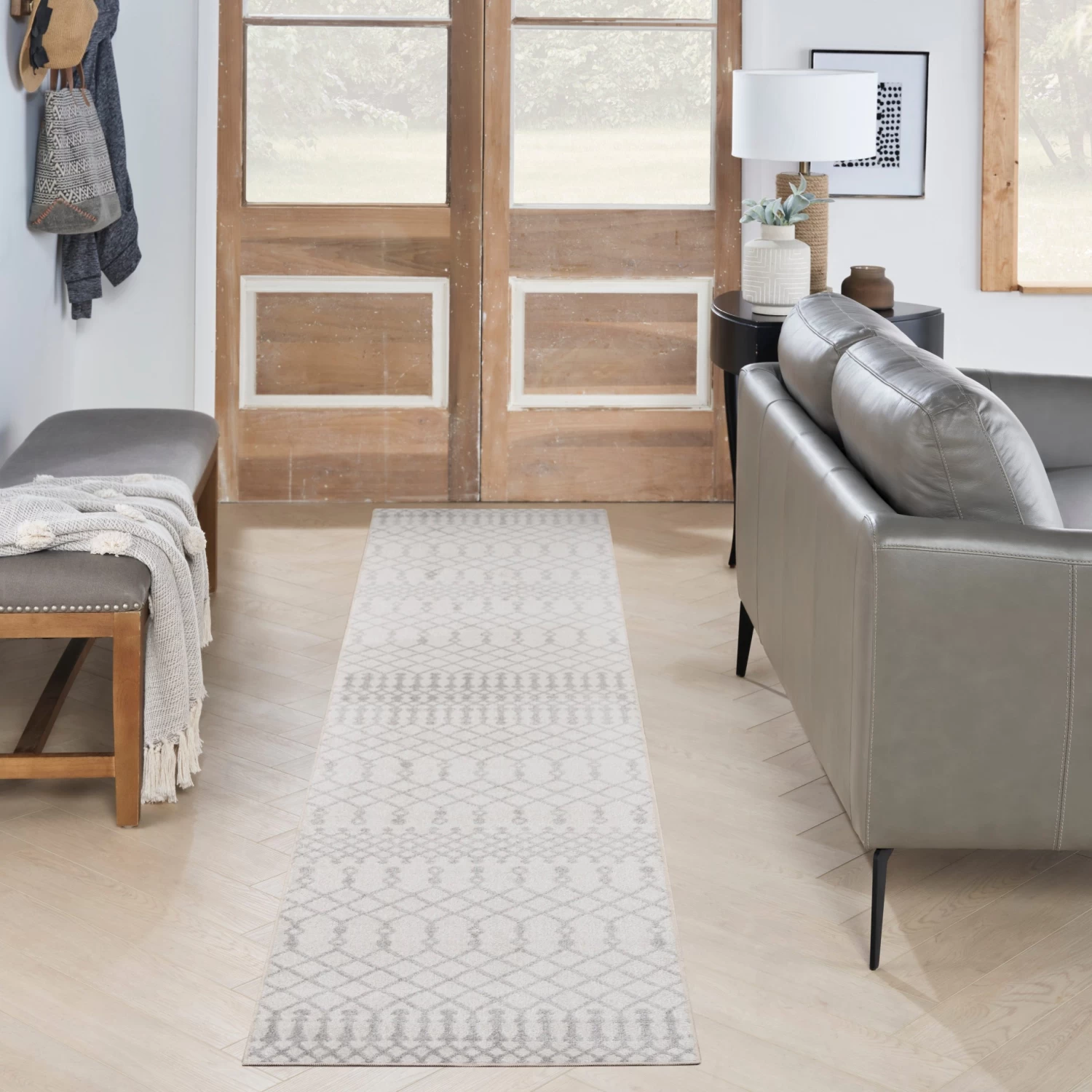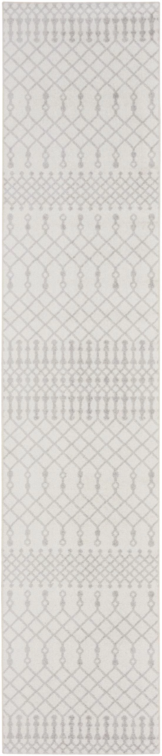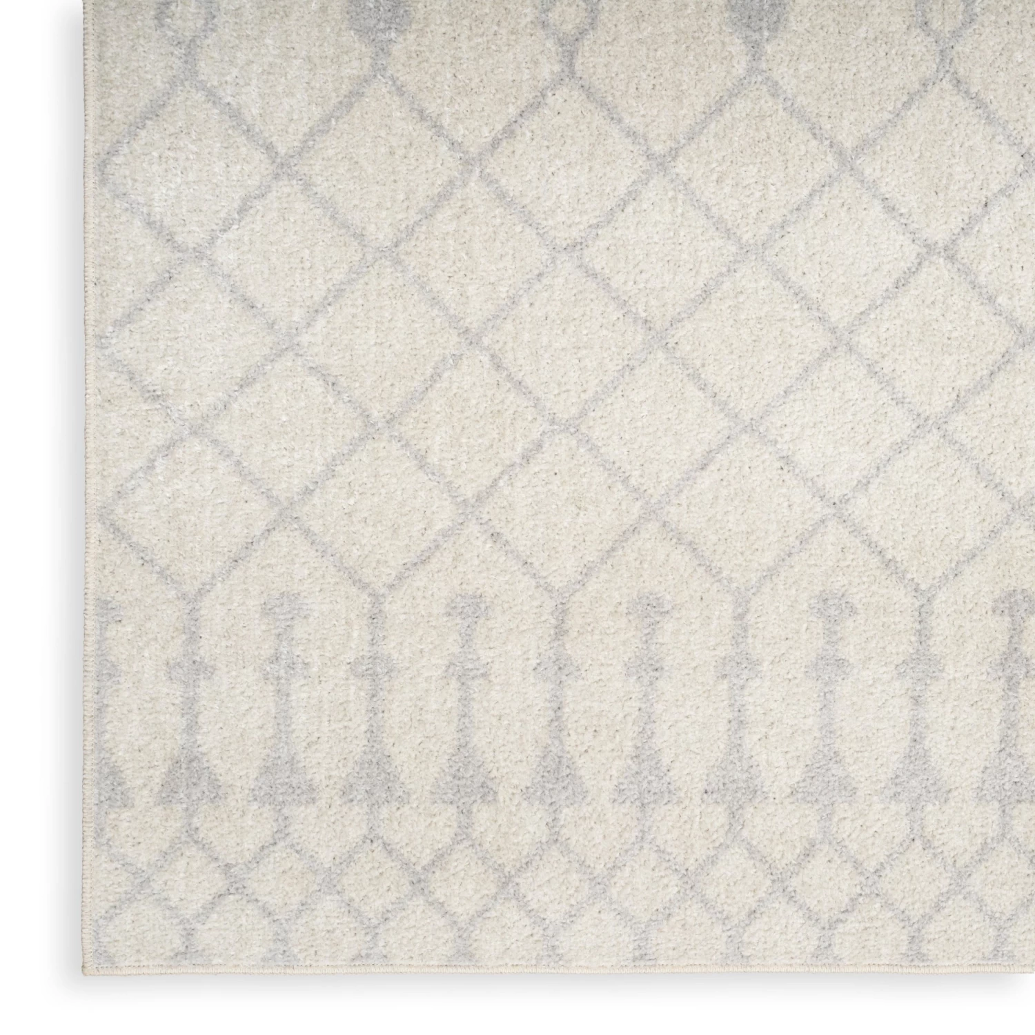 Bring global style home with this boho chic rug from the Astra Machine Washable Collection. Presented in ivory and grey, the classic Moroccan trellis pattern is finished with a vibrant sheen that shifts in tone under different light. This machine-washable rug beautifully complements modern and farmhouse décor.