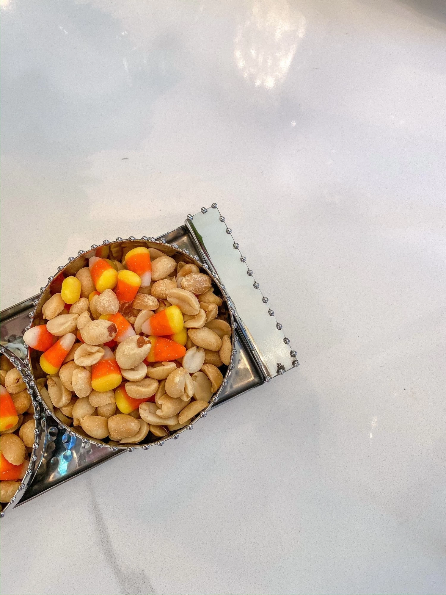 Description: This silver 3-bowl dish with tray is perfect for serving snacks in a glamorous way.