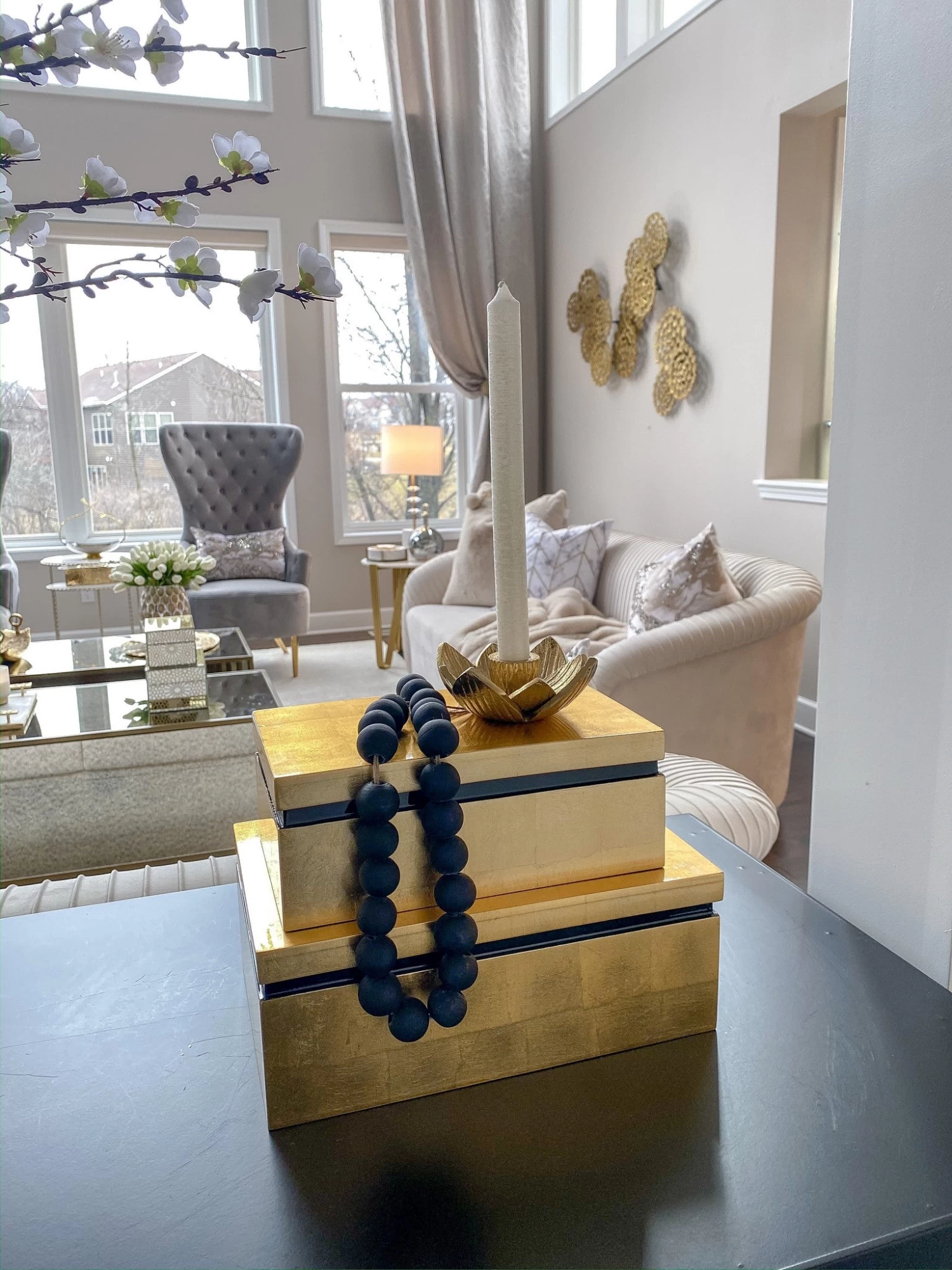 These lovely black beads are constructed of glass and feature a matte finish. They are perfect to style on a tray with your favorite decorative coffee table books, or with a nice vase.