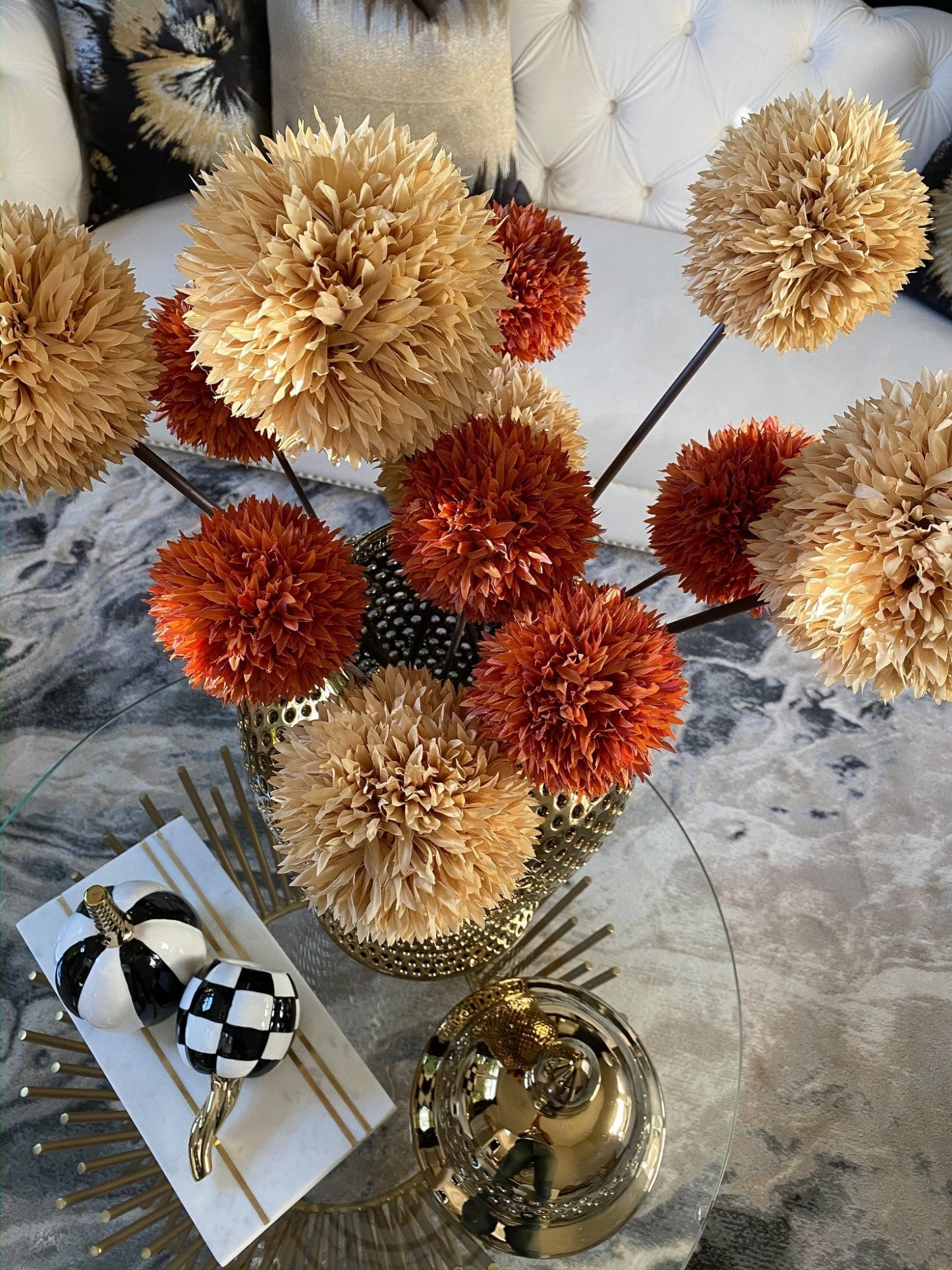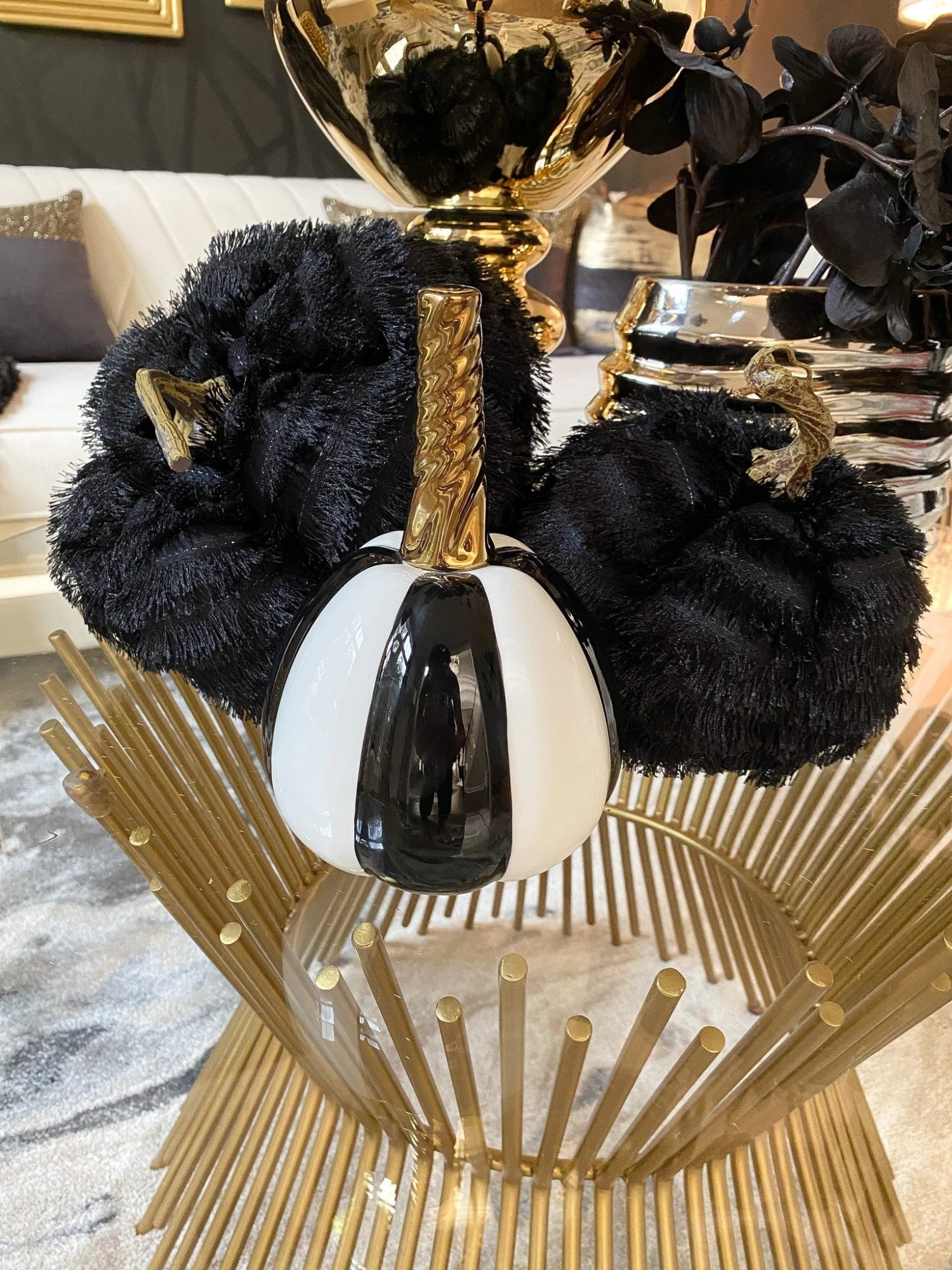 Description: This checkered, black and white pumpkin with gold stem is a fun piece to add to your fall decor!