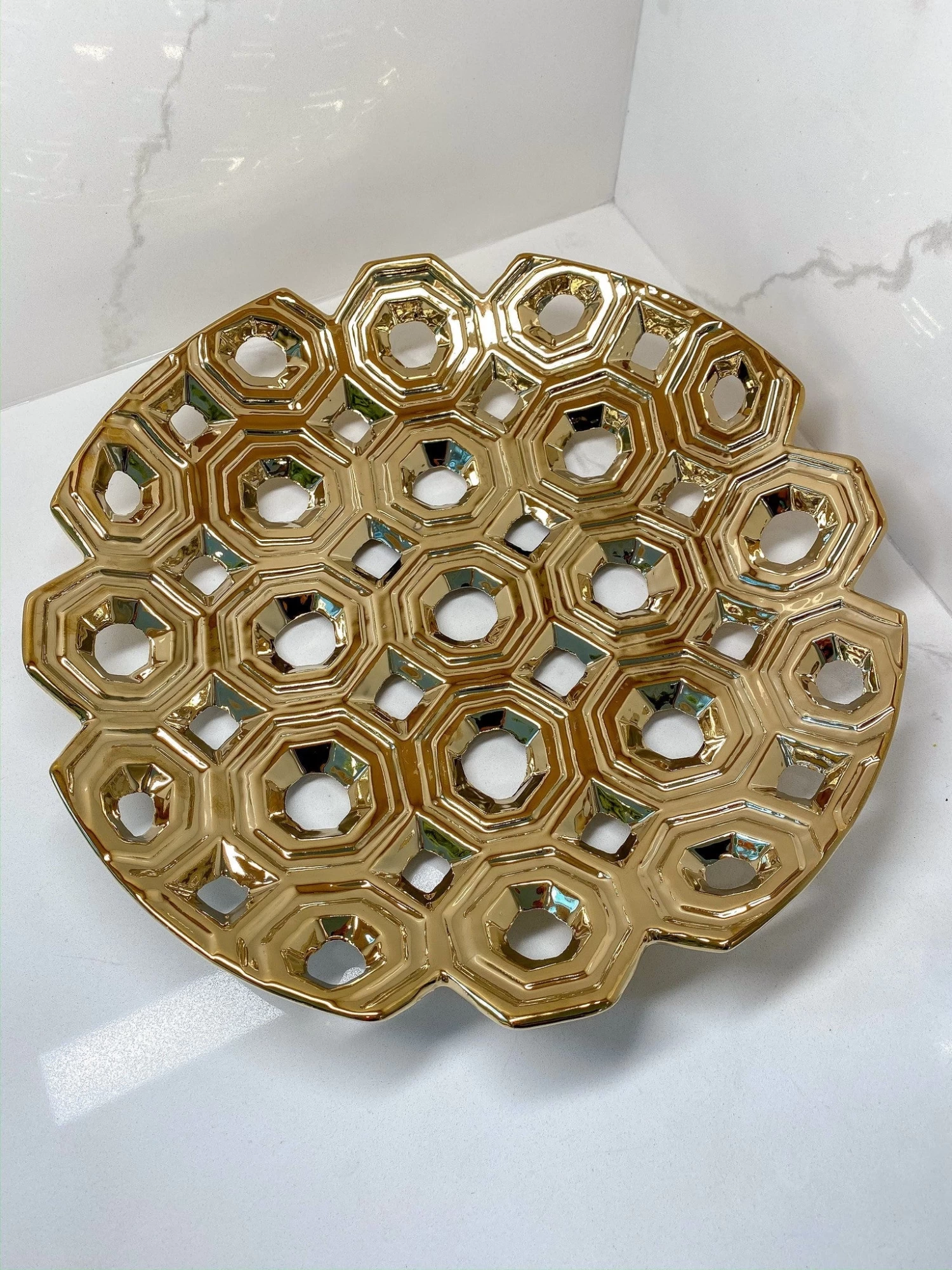 Description: This gorgeous cut-out designed platter has so many uses. This makes a wonderful fruit bowl or a layering piece for your florals. You can use to highlight your dinner plates as this unique charger plate has an intricate detail that will elevate any dining experience.