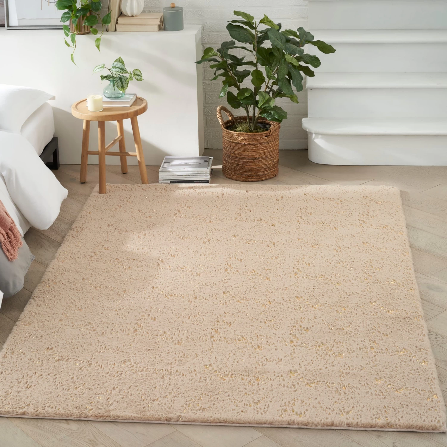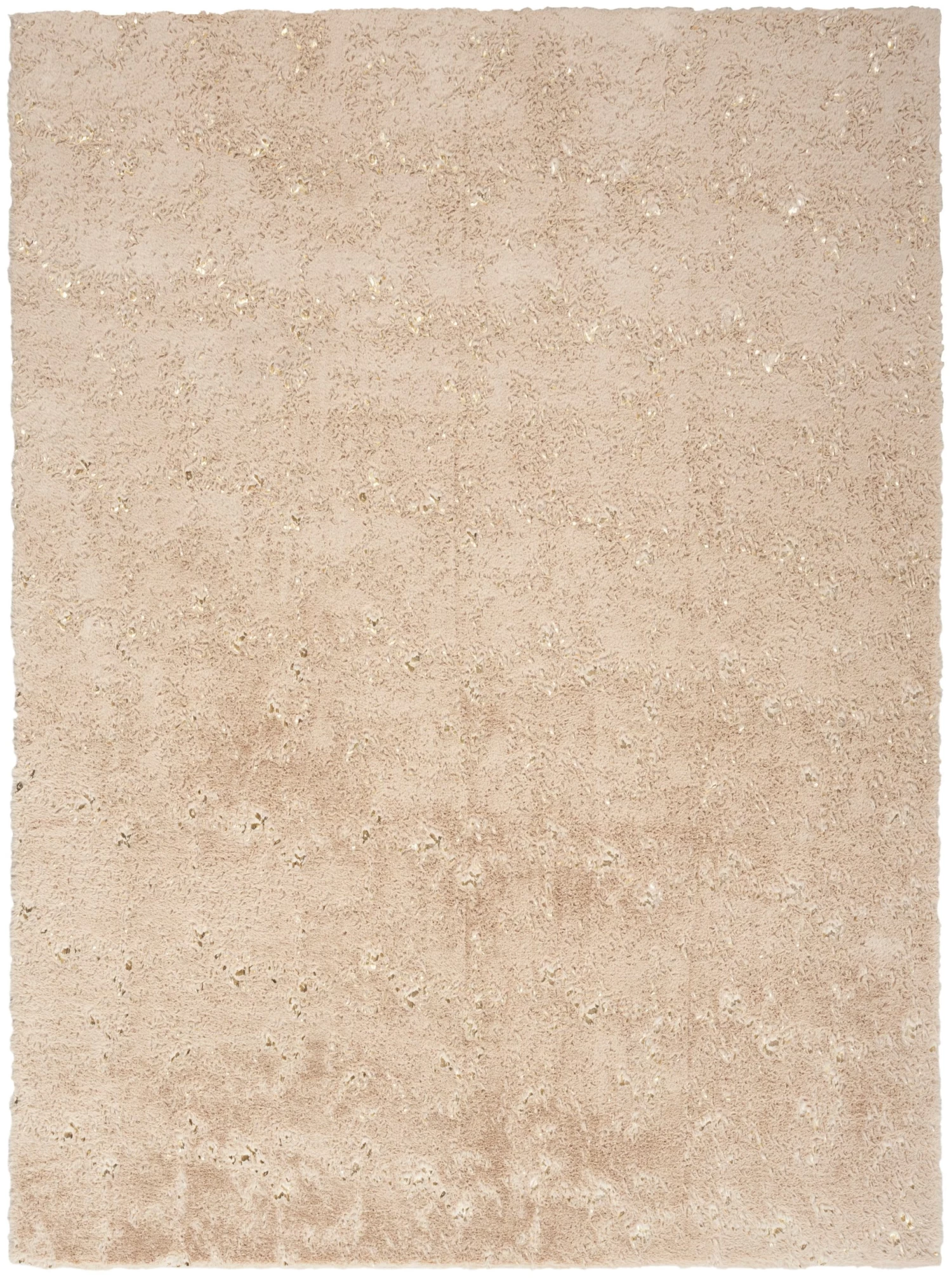 Like the warmth and comfort of your favorite fleece blanket, this beige shag rug from the Cozy Shimmer Collection generously delivers engaging texture and nuanced glamor. Hand-tufted from polyester yarns, this plush rug is accented with metallic gold highlights that offer a modern touch. A non-slip back adds safety and practicality, keeping the rug in place while protecting your floors.