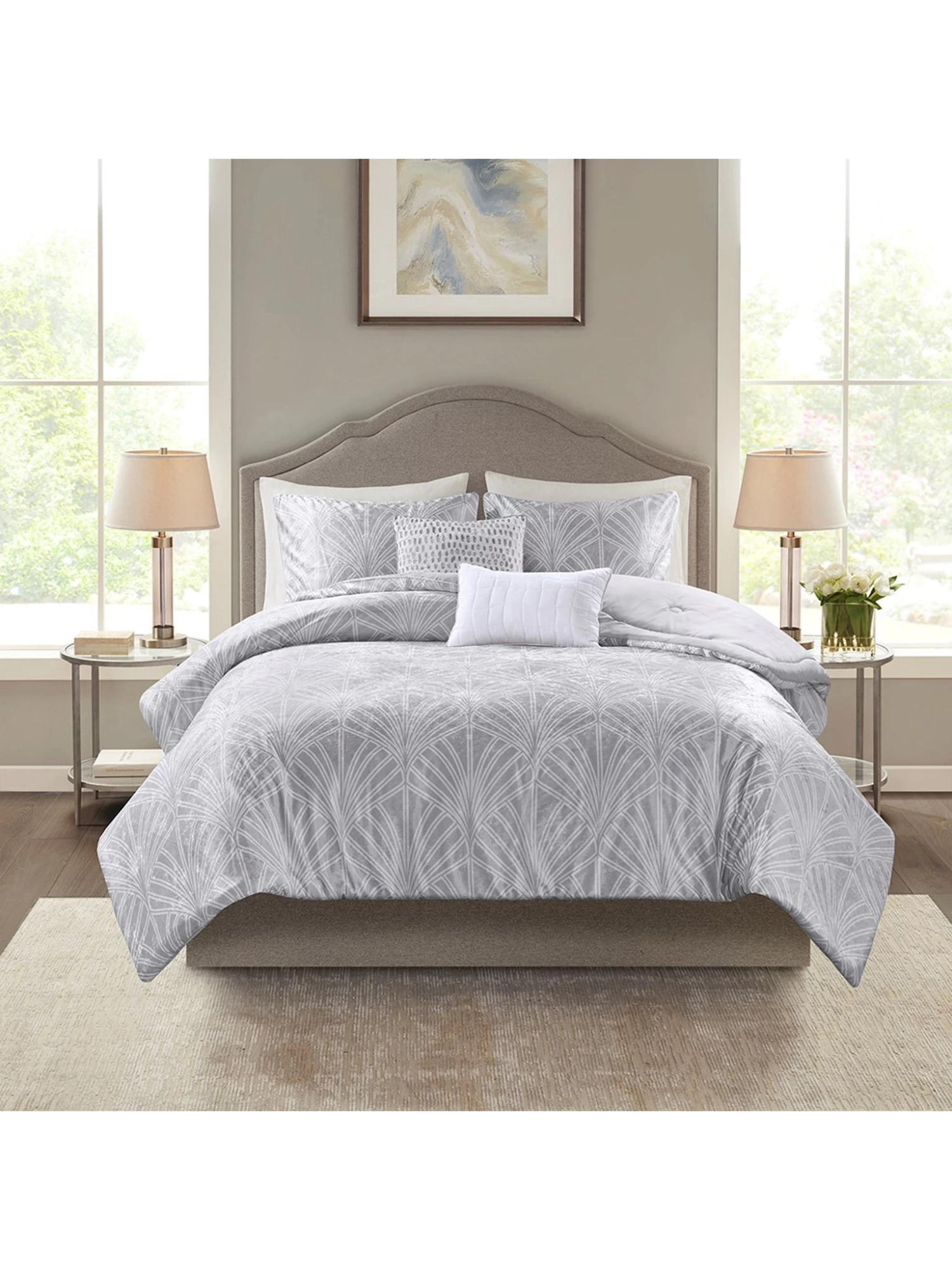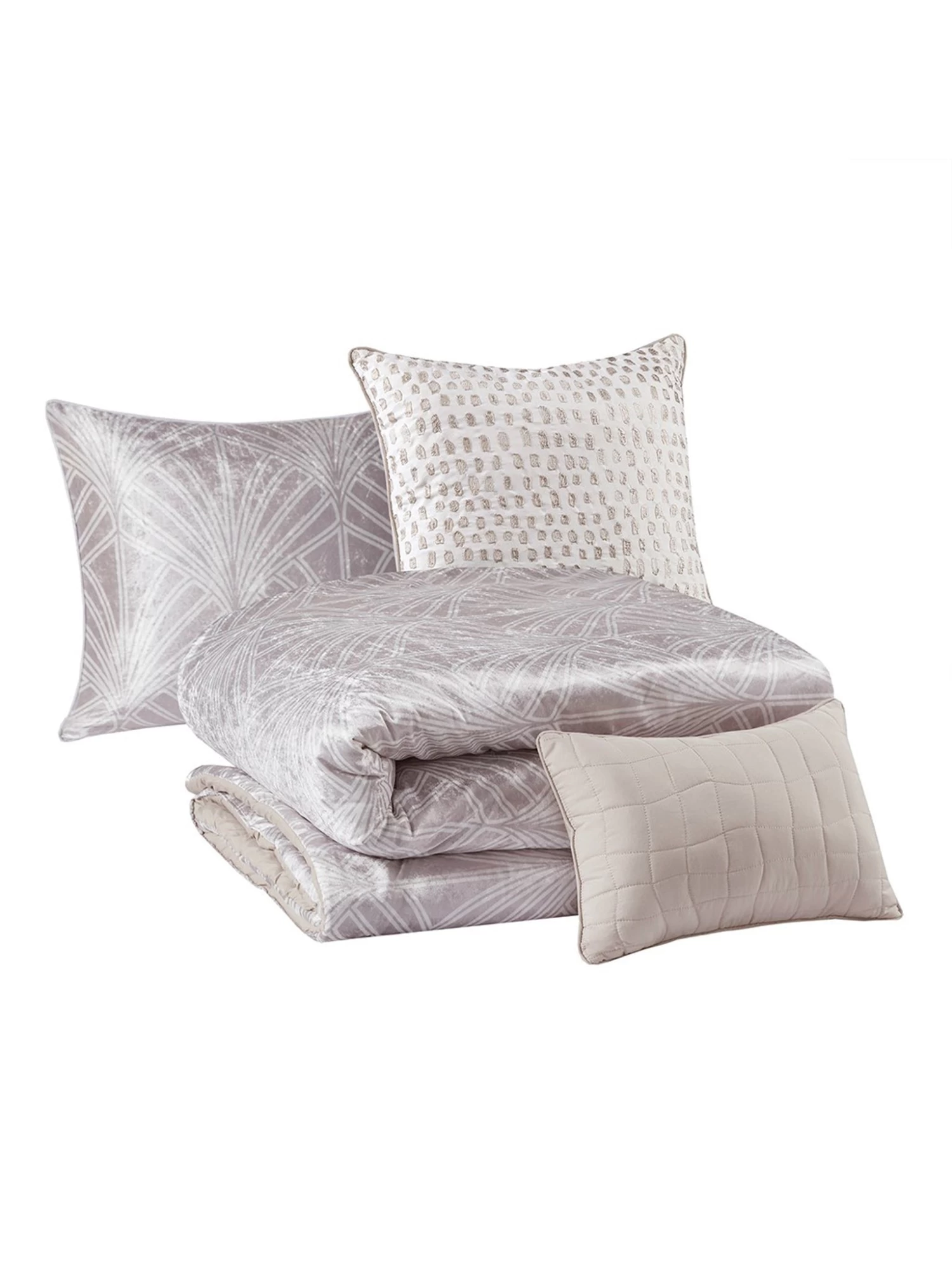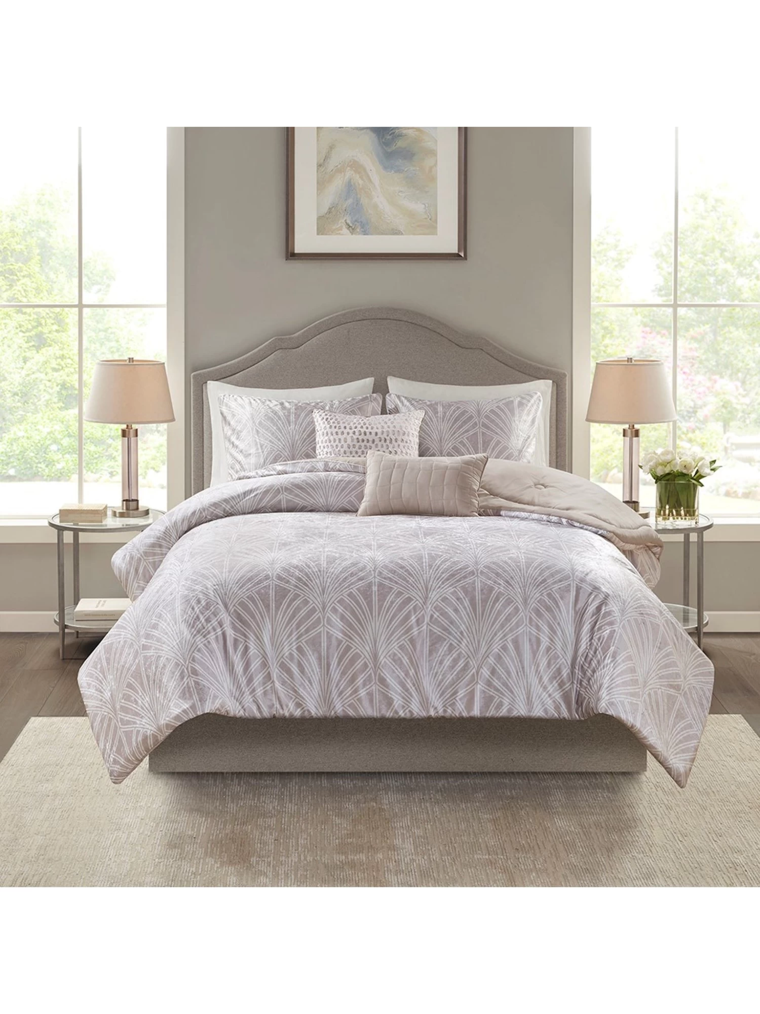 Description:Â Give your bedroom a luxurious update with the 5 Piece Crushed Velvet Comforter Set. The oversized champagne crushed velvet comforter set features an art deco pattern for an elegant bedroom style. Embroidered abstract patterns in the square pillow and oblong pillow add the finishing touches to complete the look. Machine washable for easy care, this crushed velvet comforter set adds elegance to your bedroom and uses hypoallergenic filling to provide exceptional warmth and comfort.