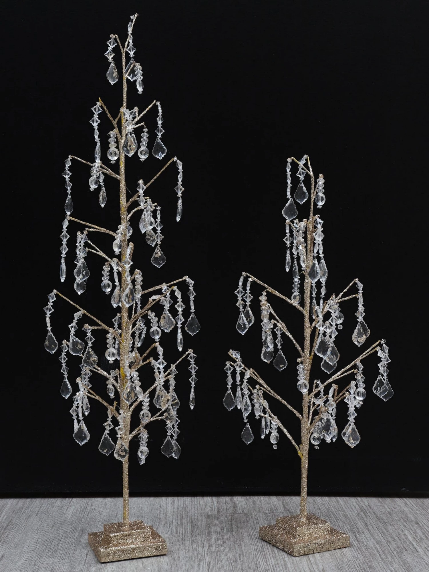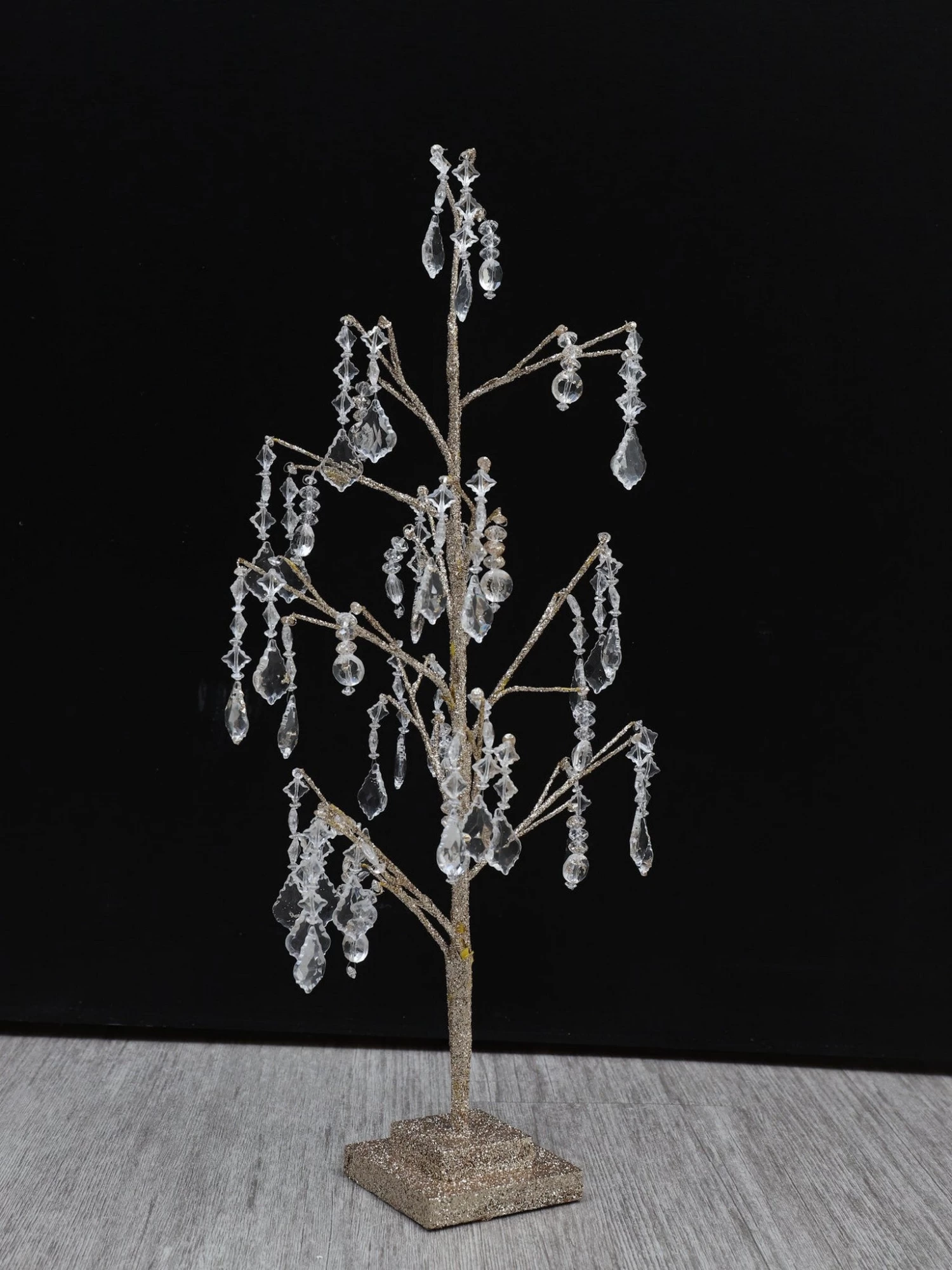 Description: This crystal drop, glittered tree is a stunning way to bring texture to your holiday decor. Perfect to leave up all winter and tie back perfectly to our crystal drop stems as well!