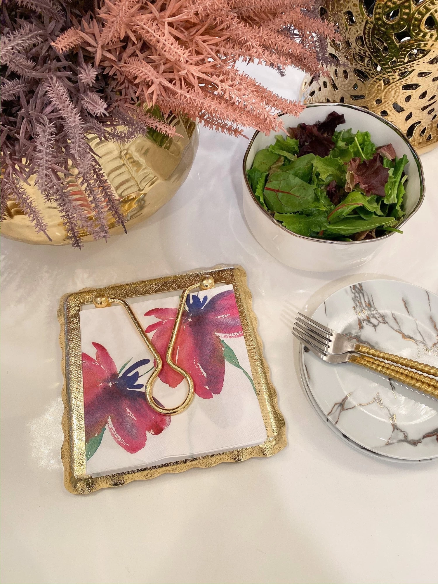 Glass Rectangular Tray With Intricately Detailed Gold Handles With White & Gold Rose Details