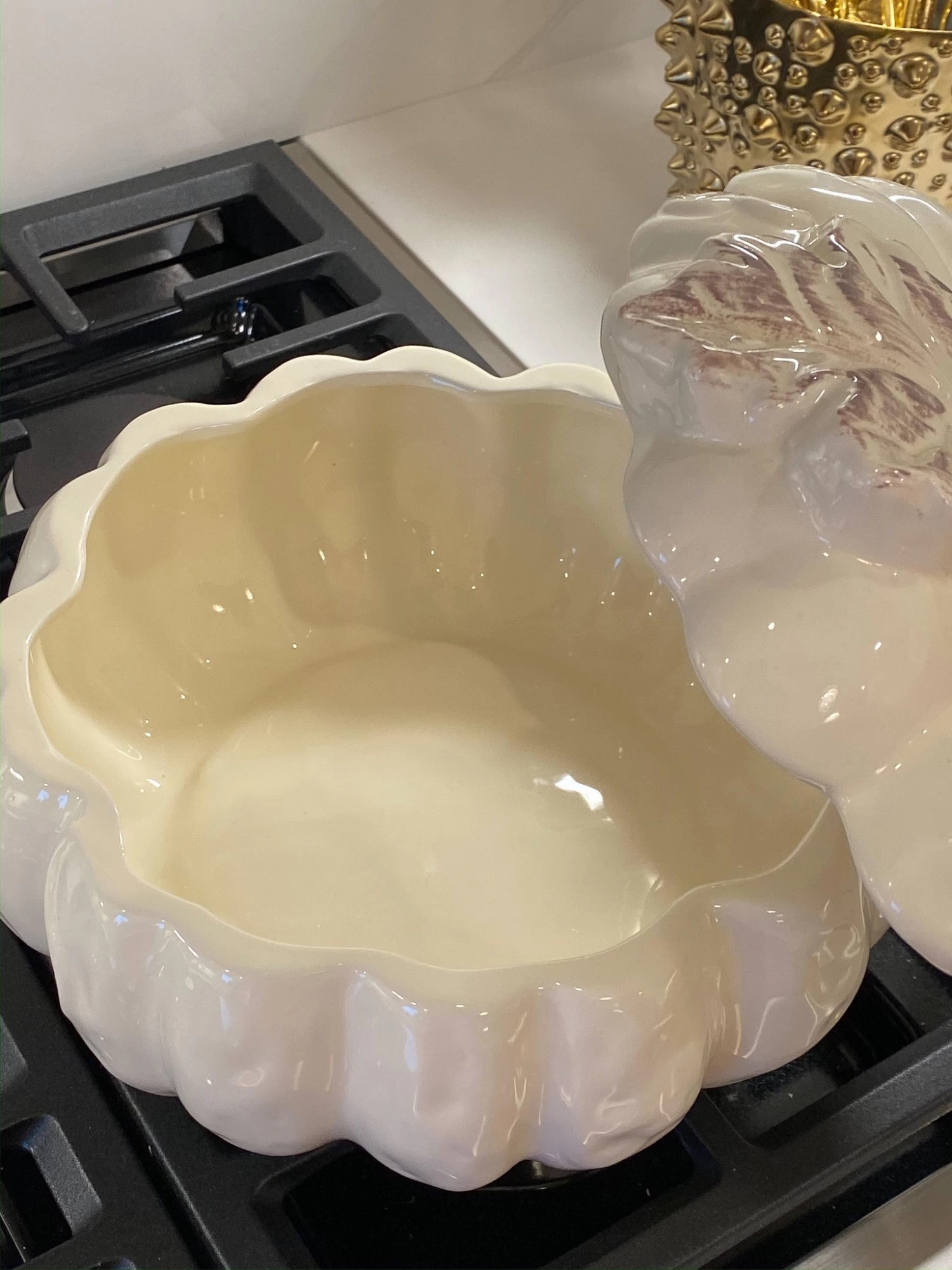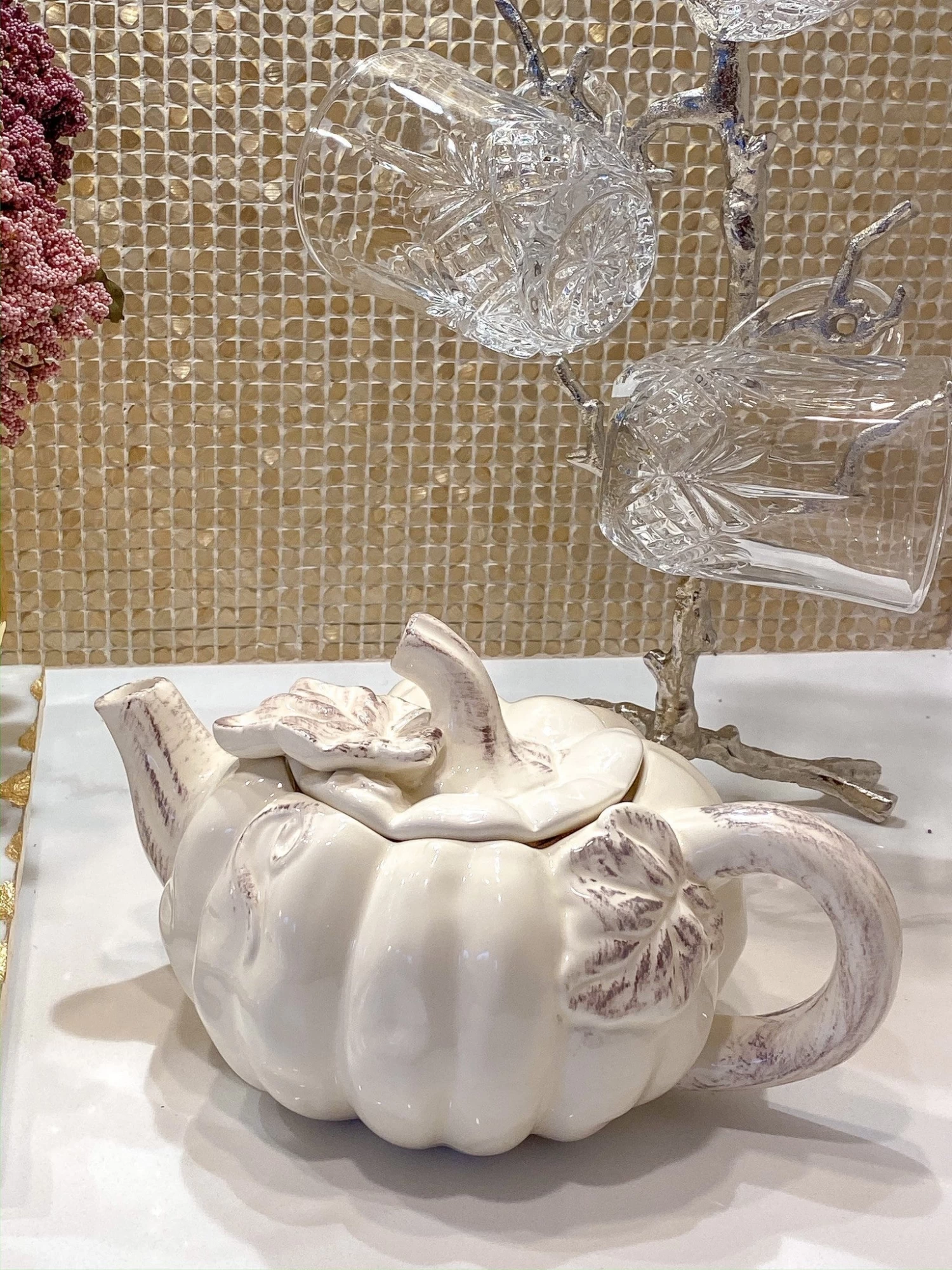 Description: This collection is a stunning way to decorate for fall! Store your snacks in style with these lidded pumpkin containers and serve your guests their favorite drinks in the pumpkin teapot. These look beautiful on any countertop.