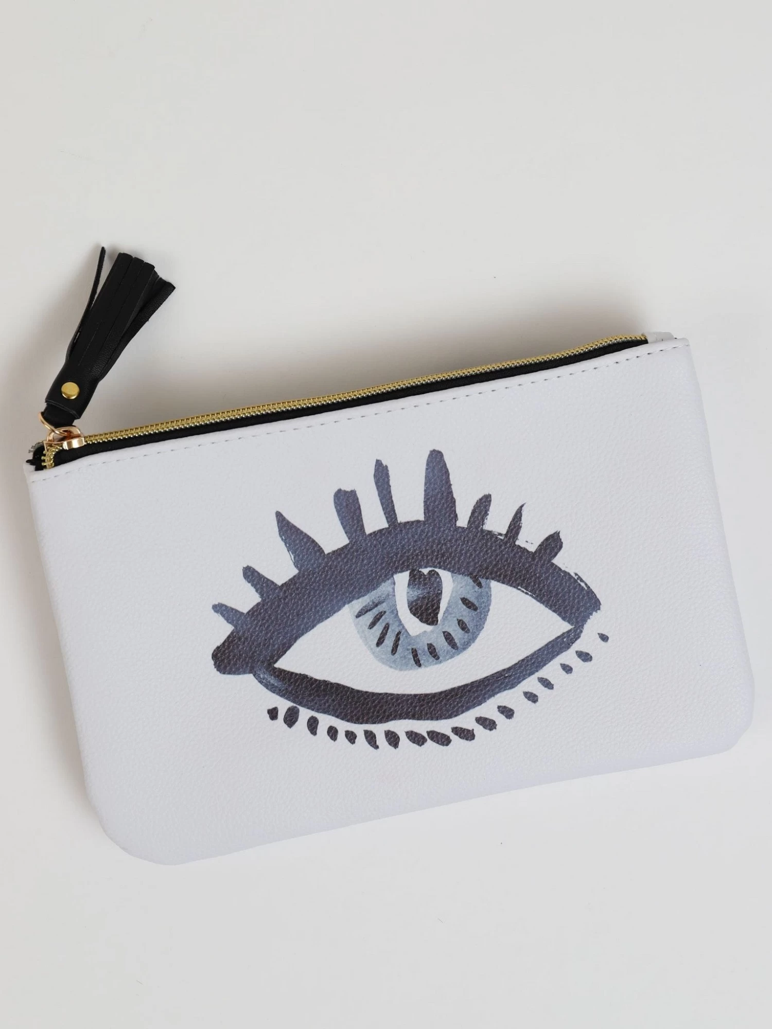 Description: These stylish evil eye pouches are the perfect accessory for travel or makeup storage! The faux leather finish offers an elegant style, and the look is complete with a gold metal zipper and black tassel charm.
