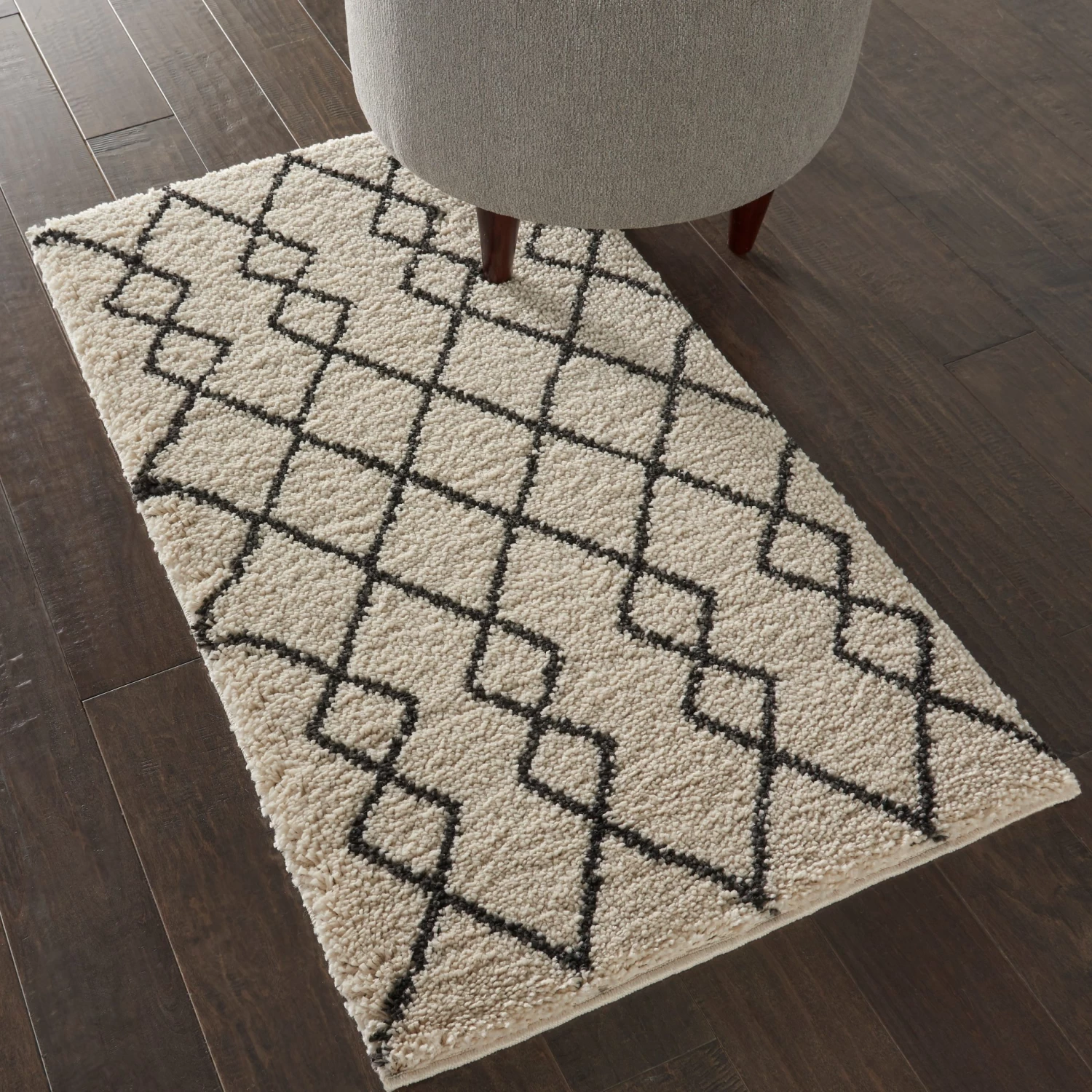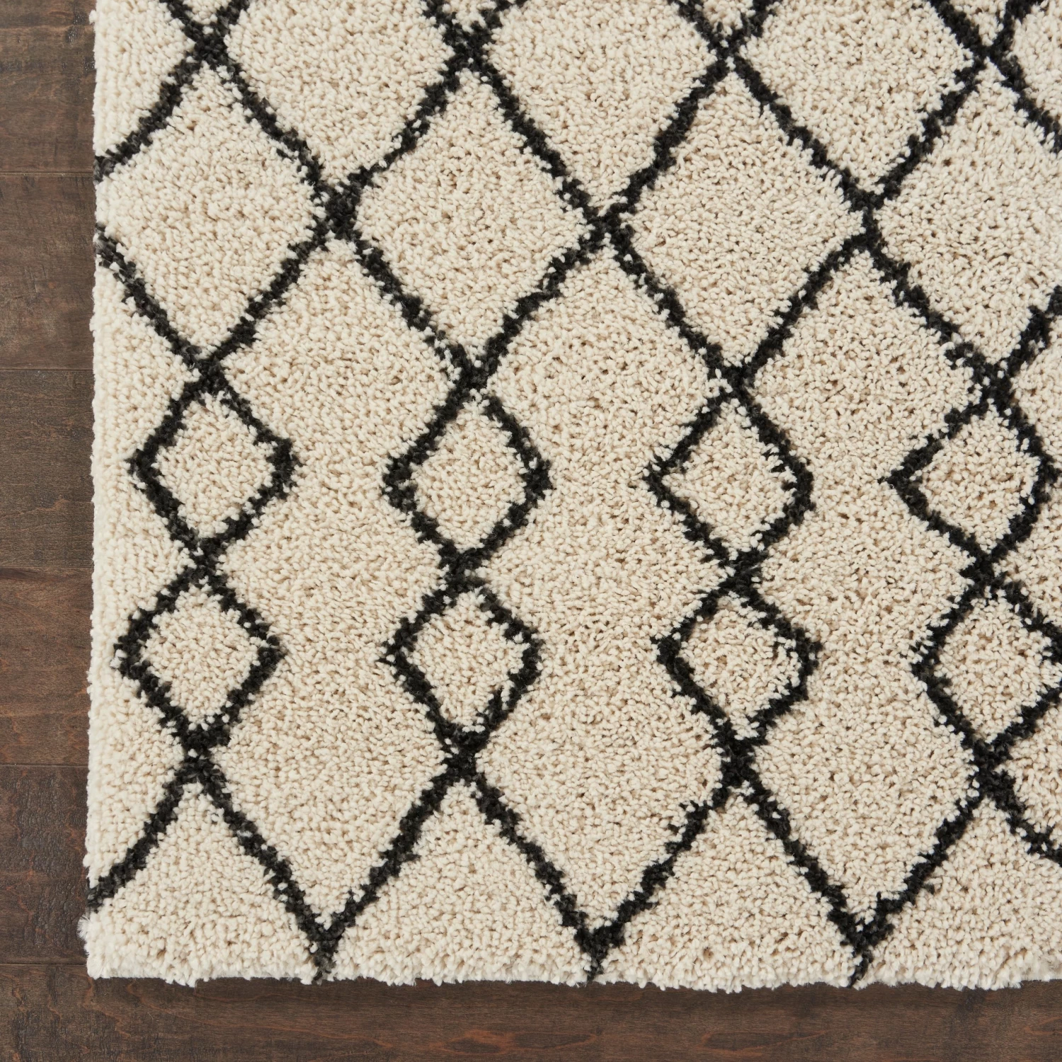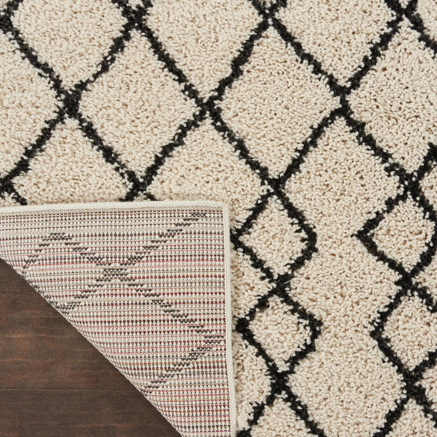 With hand-drawn linear tribal patterns interlacing across a thick, ivory white shag pile, this Geometric Shag Collection rug brings you all the comfort and exotic flavor of an authentic Moroccan shag rug. With plush easy-care fibers, this rug will bring an affordable touch of warmth and texture to any room, blending with a range of interior dรฉcor styles.