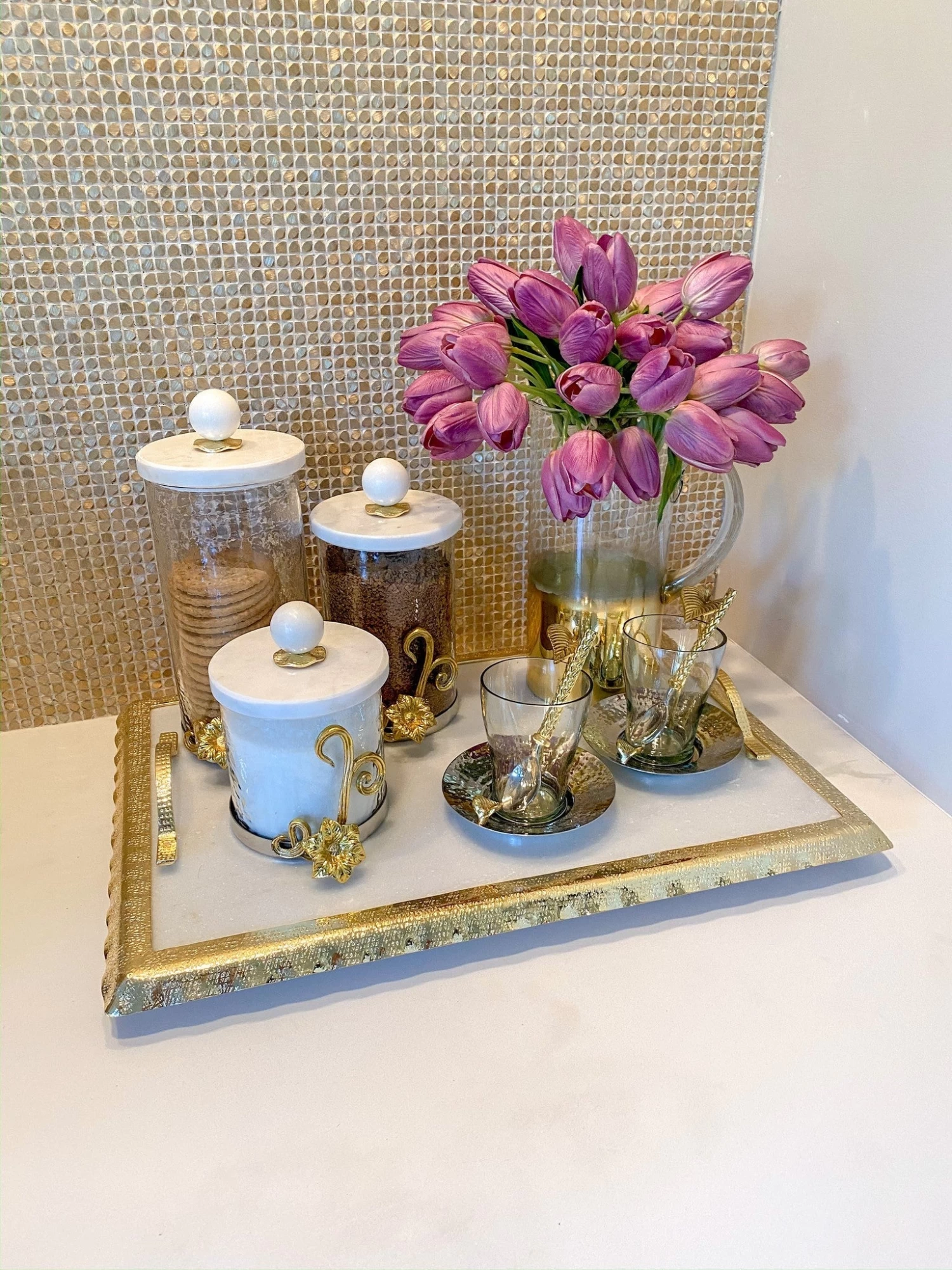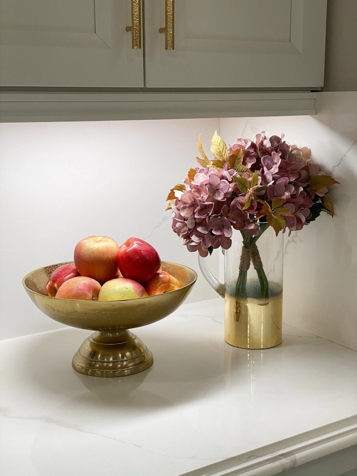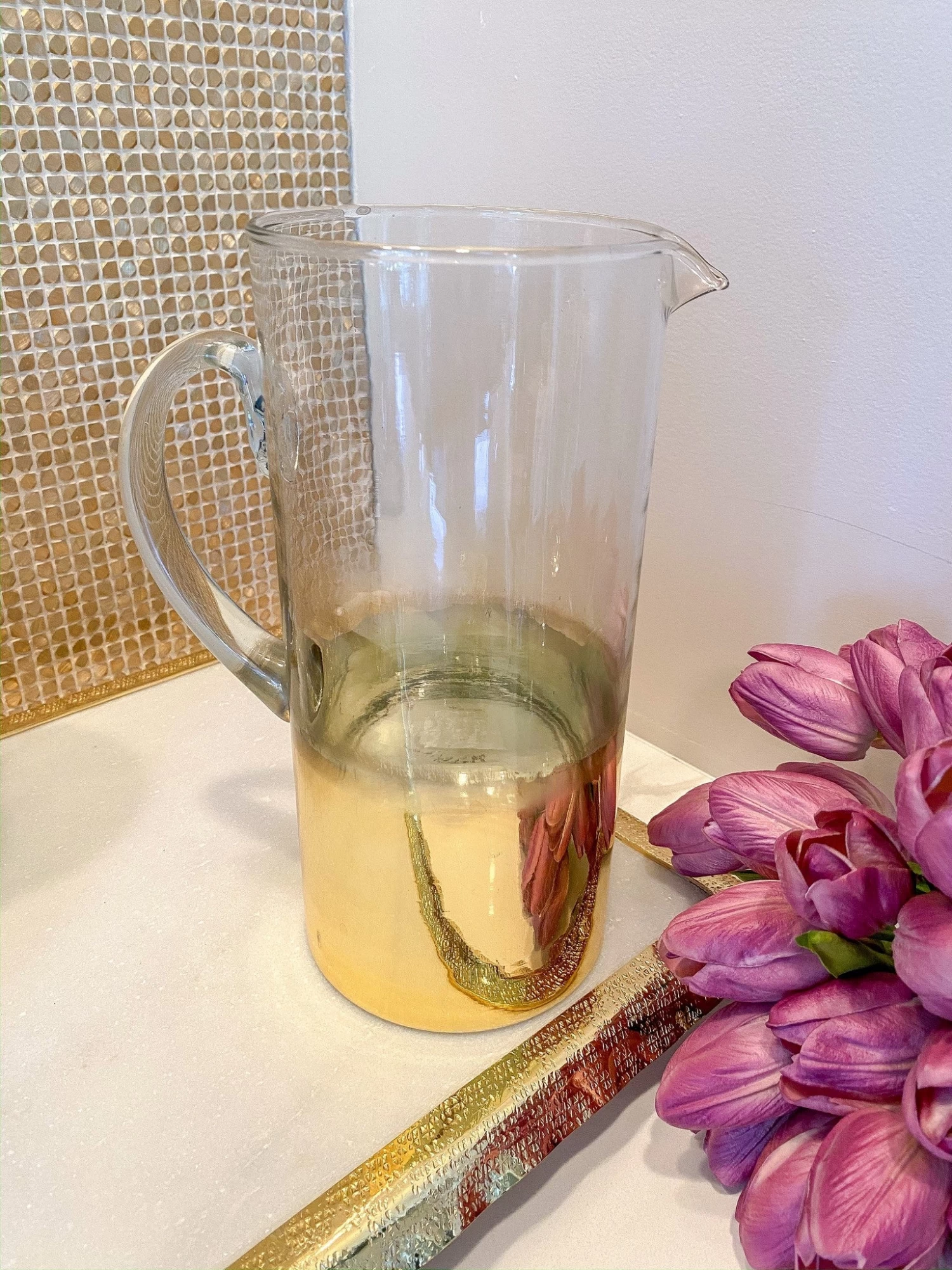 This glass pitcher features a distressed gold ombre finish and is perfect to serve your favorite drinks or to use as a vase for your favorite fall florals!