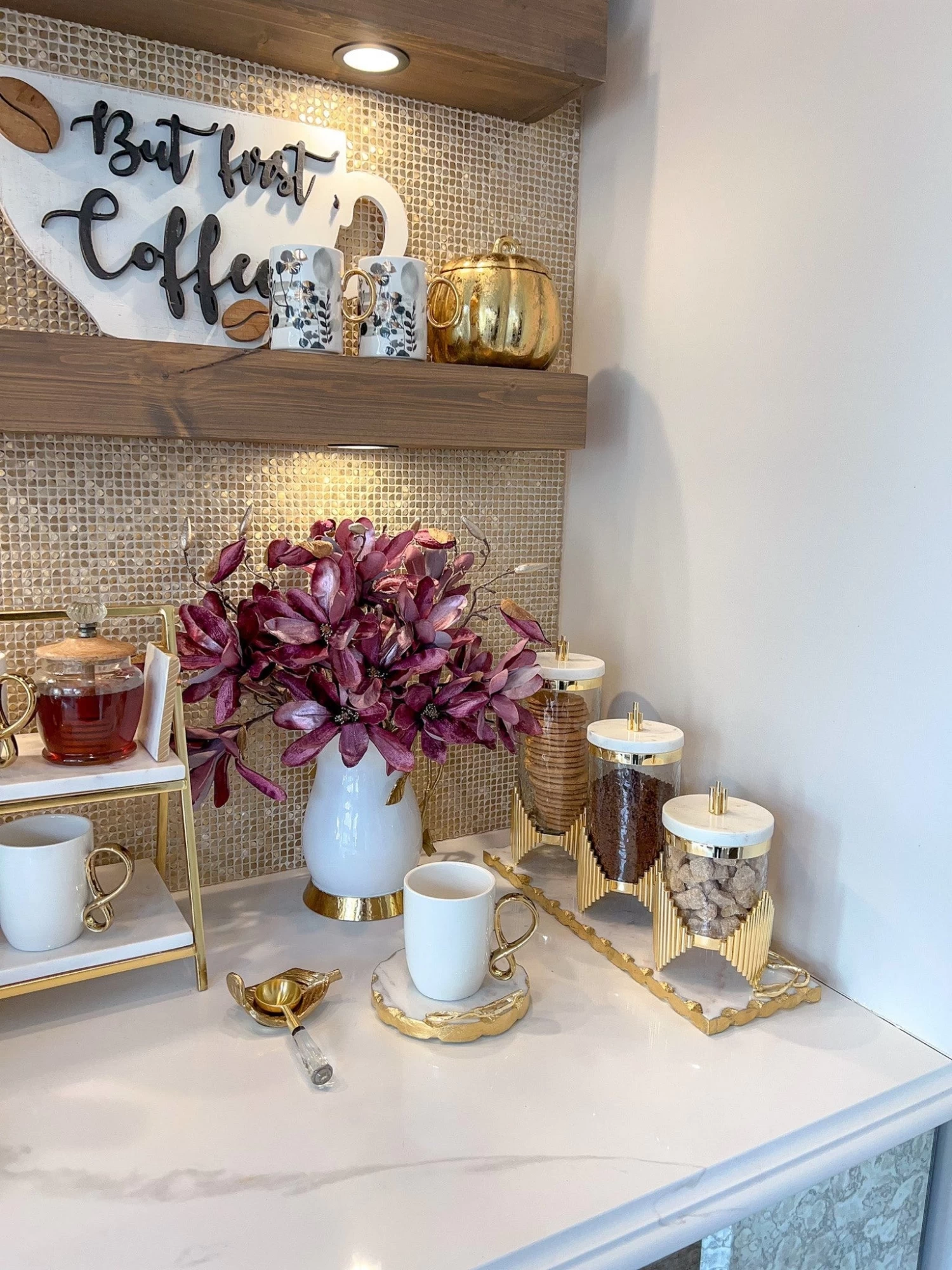 Description: These stunning glass canisters sit atop a gold diamond shaped base with linear details and is absolutely stunning and will elevate your coffee station to a whole new level!