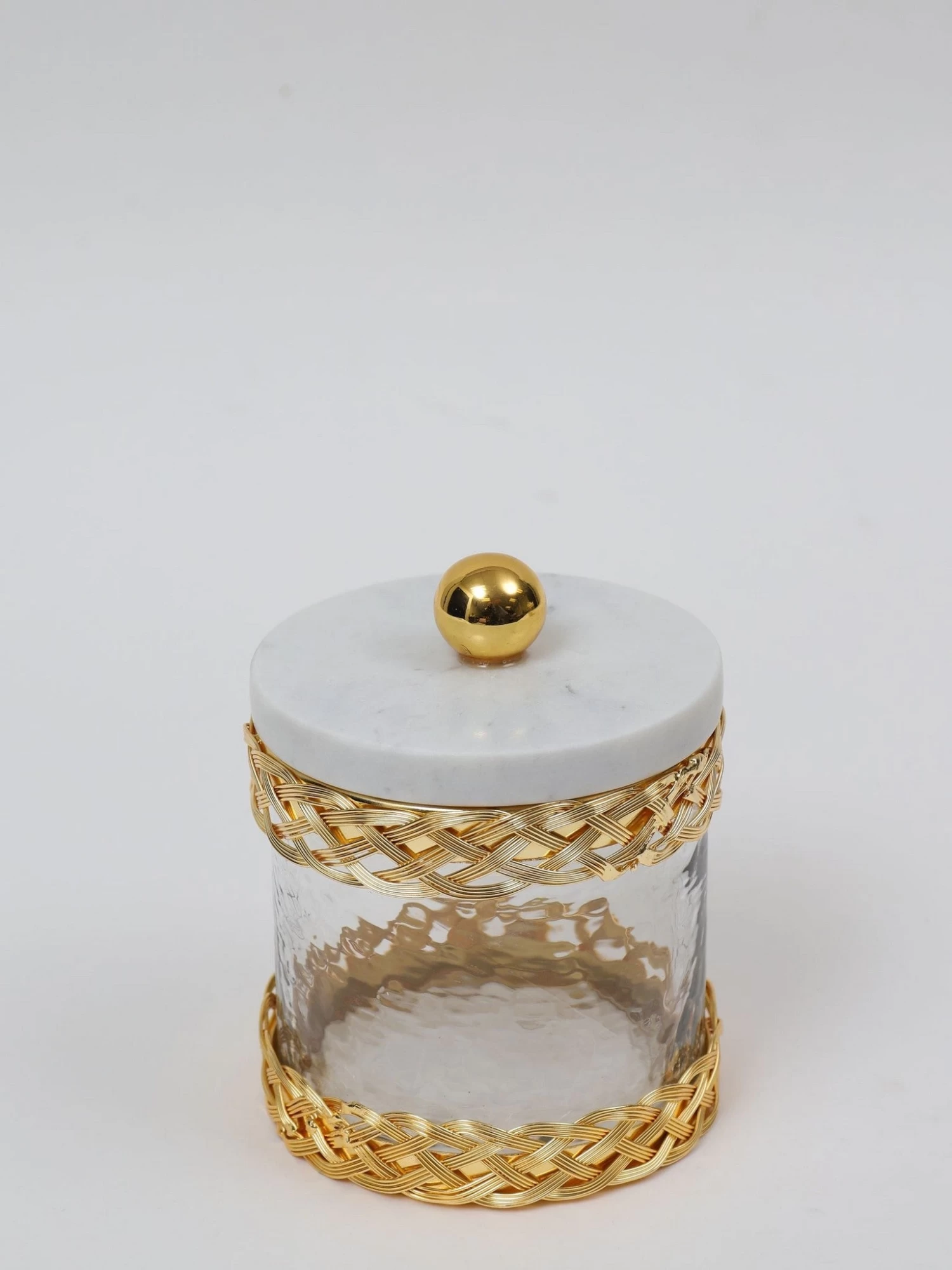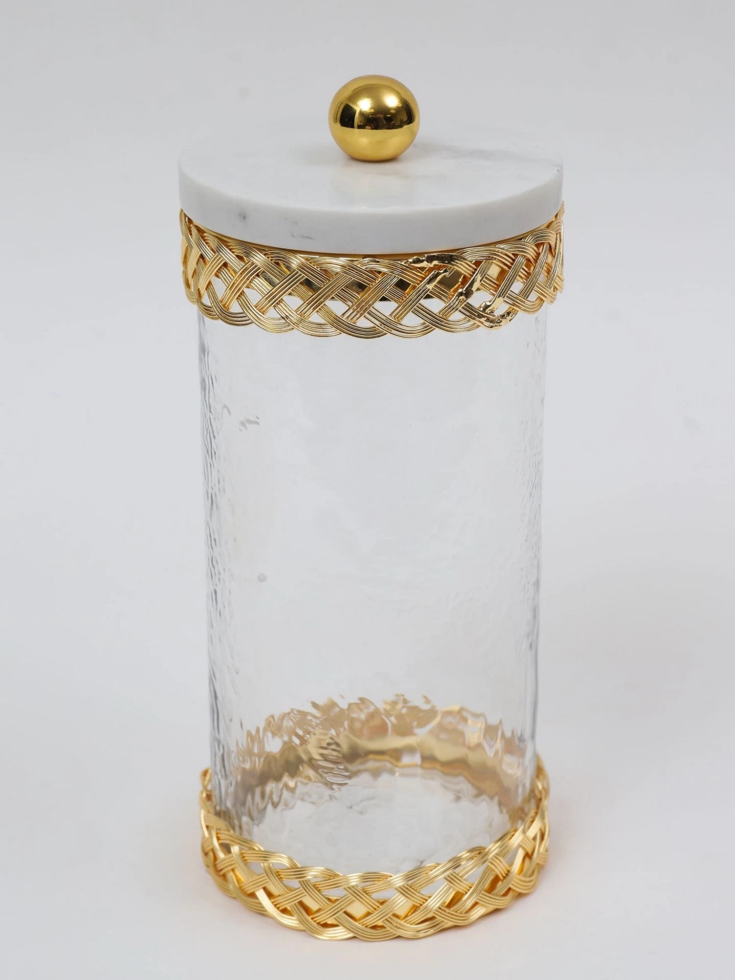 Description: These beautiful glass canisters have a golden lattice design and a marble top with a gold accent. What a stunning way to showcase on your coffee station, kitchen counter, or anywhere you need storage. These would look fabulous in your bathroom as well.