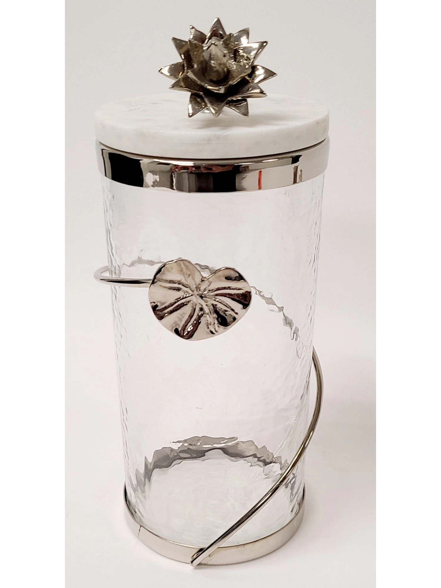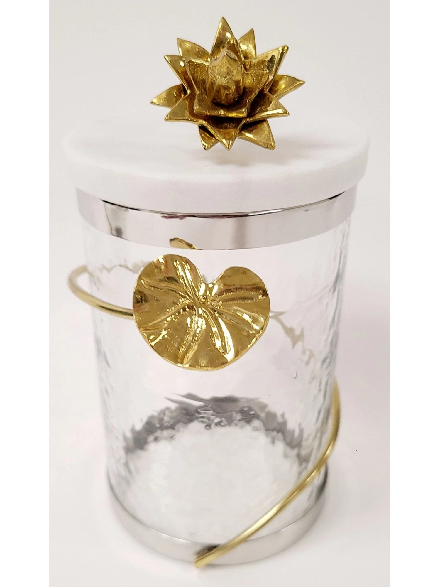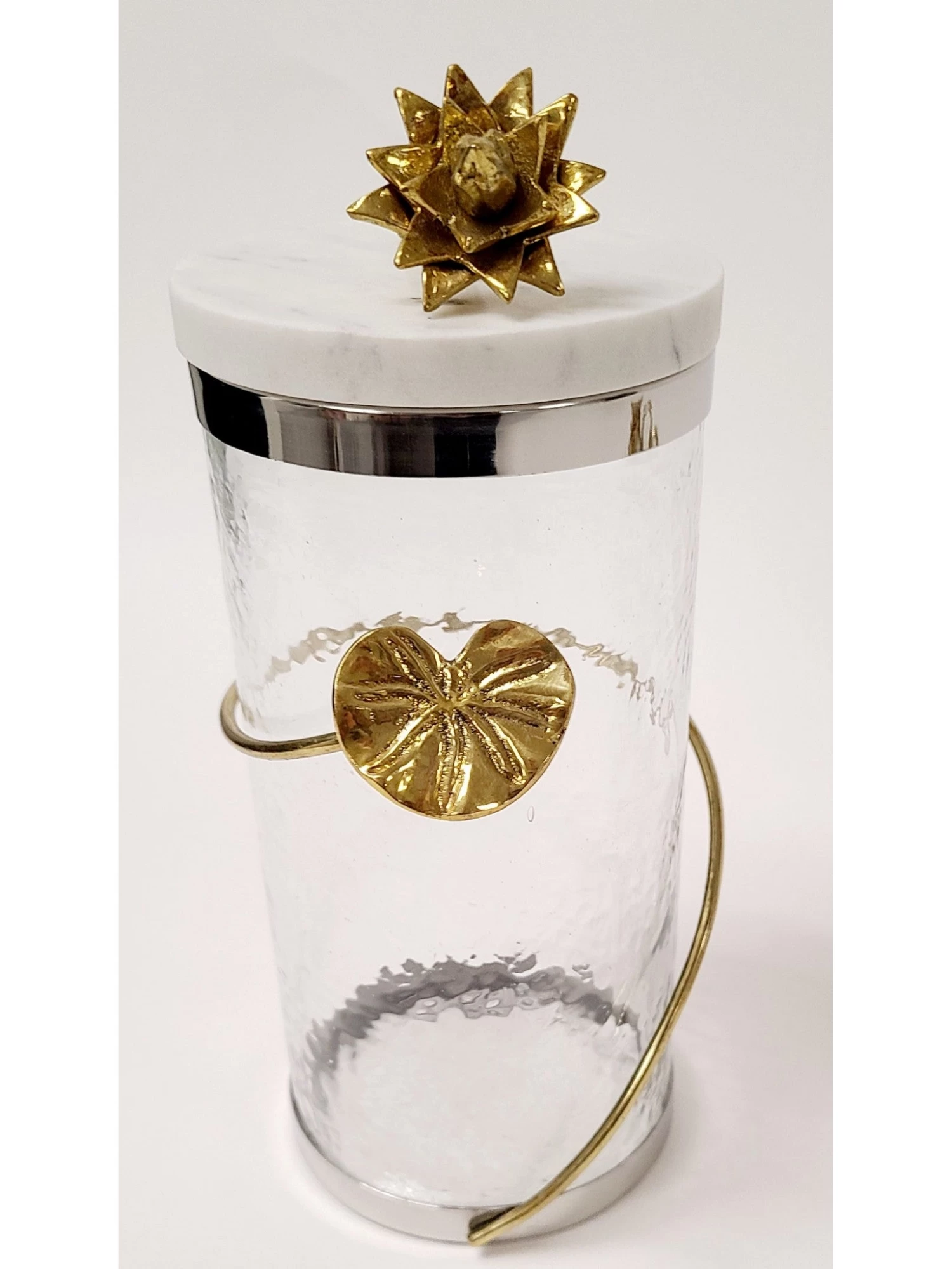 Description: This glass canister with has a beautiful gold leaf design wrapping around the canister and a marble lid with a metal flower design. You can use it at a coffee station in conjunction with the other two sizes to make for a glamorous coordinating display.