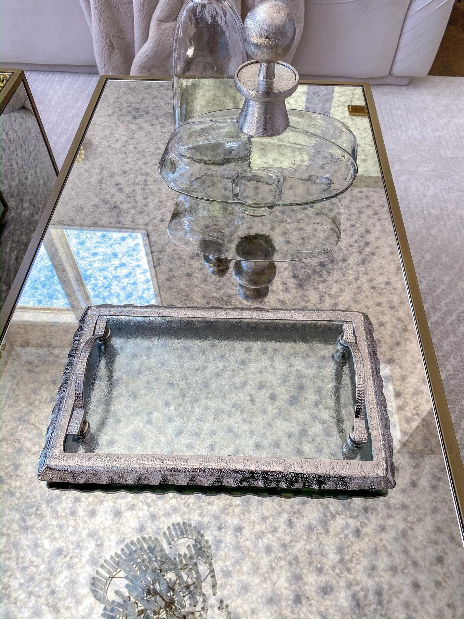 Description: This glass tray features beautiful silver ruffle edging to elegantly display your decor.