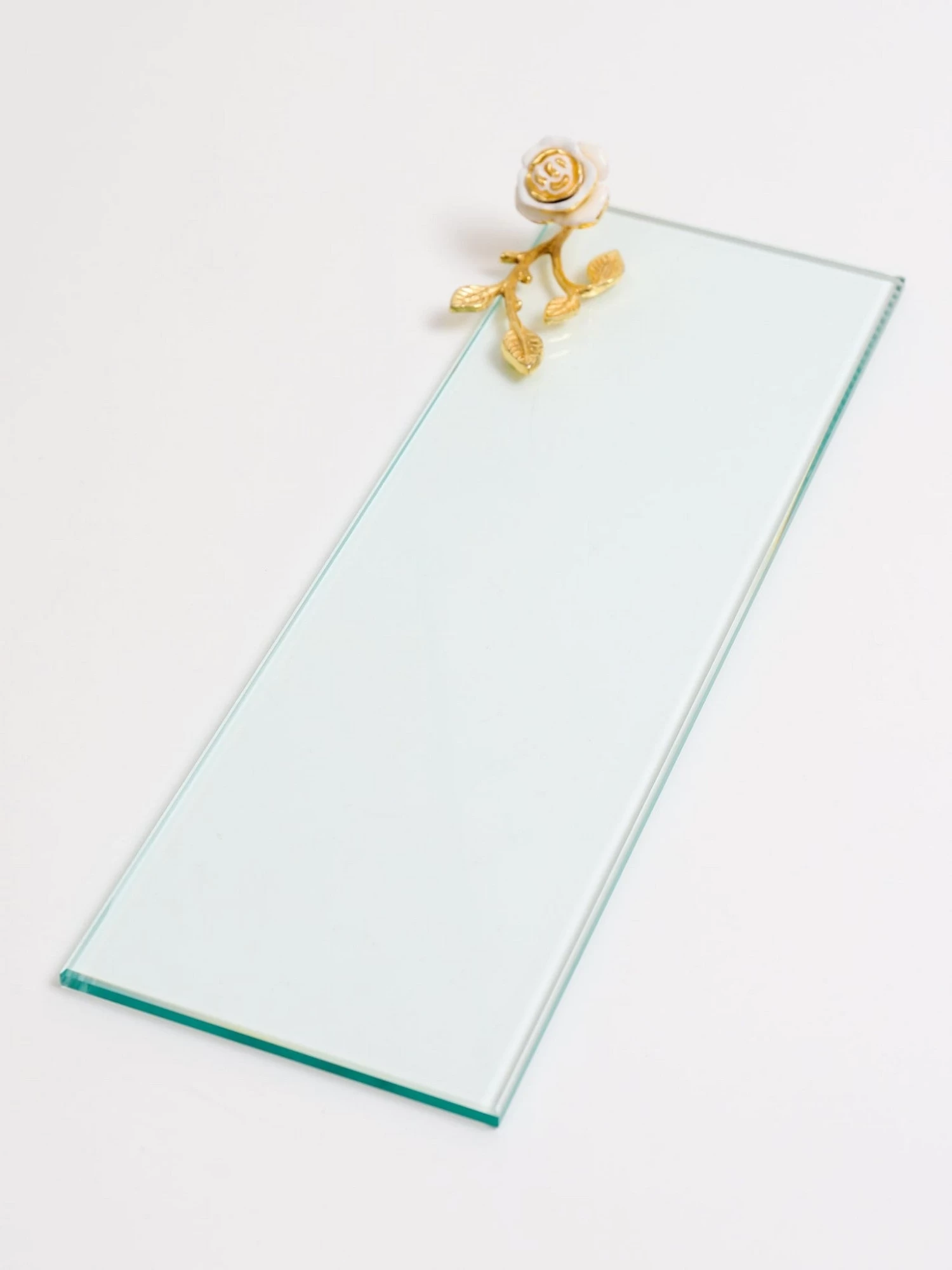 Description: This beautiful rectangular glass tray has stunning gold details with a white & gold rose flower design!