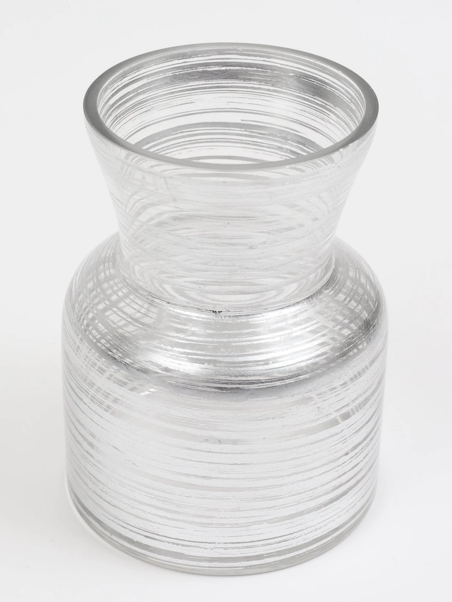 Description: This small vase is perfect for the kitchen counter or anywhere tight on space. The silver metallic swirl design adds an elegant charm!