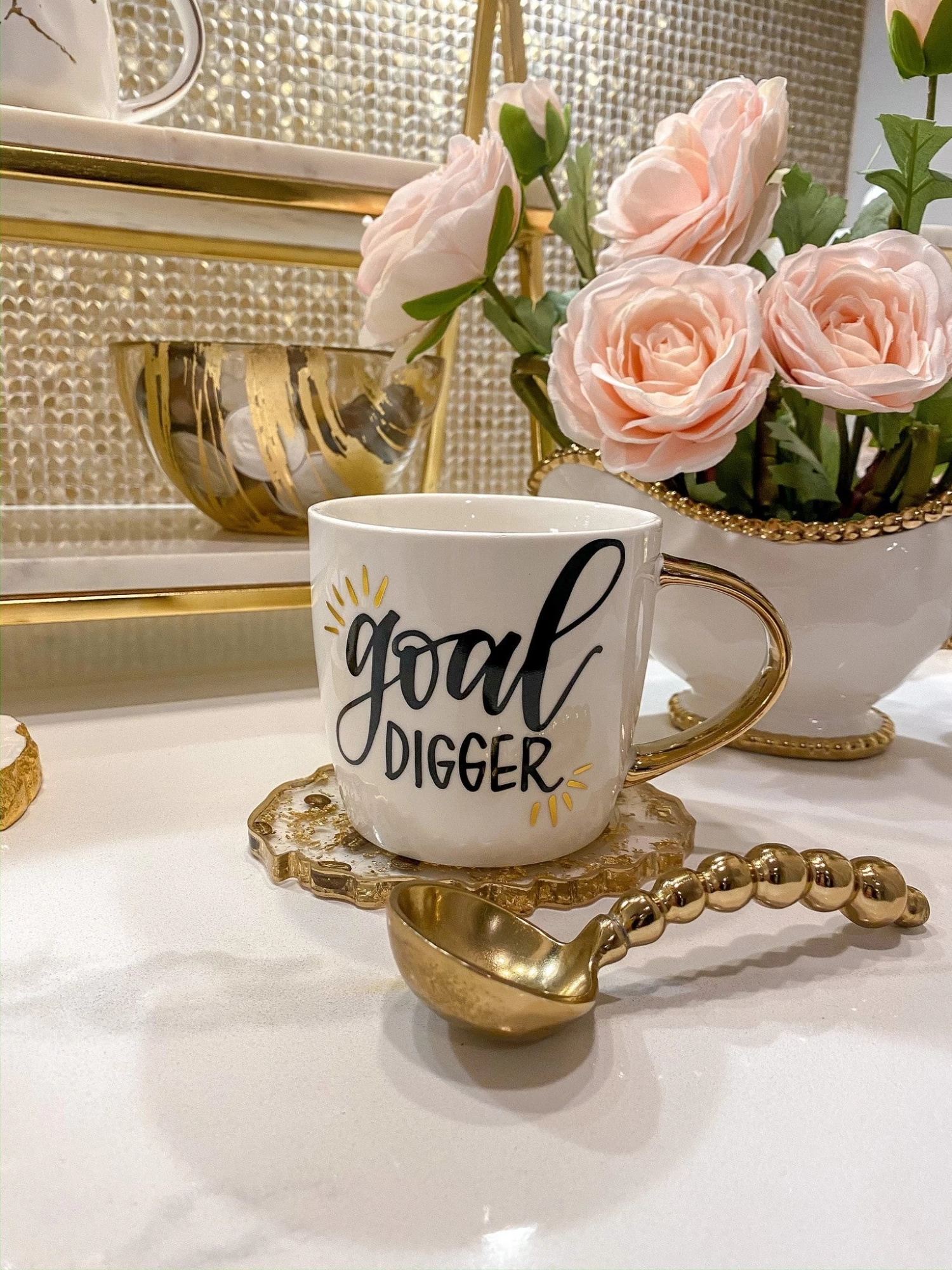 Description:Â If you are someone who is constantly working towards achieving your aspirations, then the Goal Digger mug is the perfect accessory for you! Not only is it visually appealing with its sophisticated gold handle, but it also serves as a reminder of your dedication to your goals.