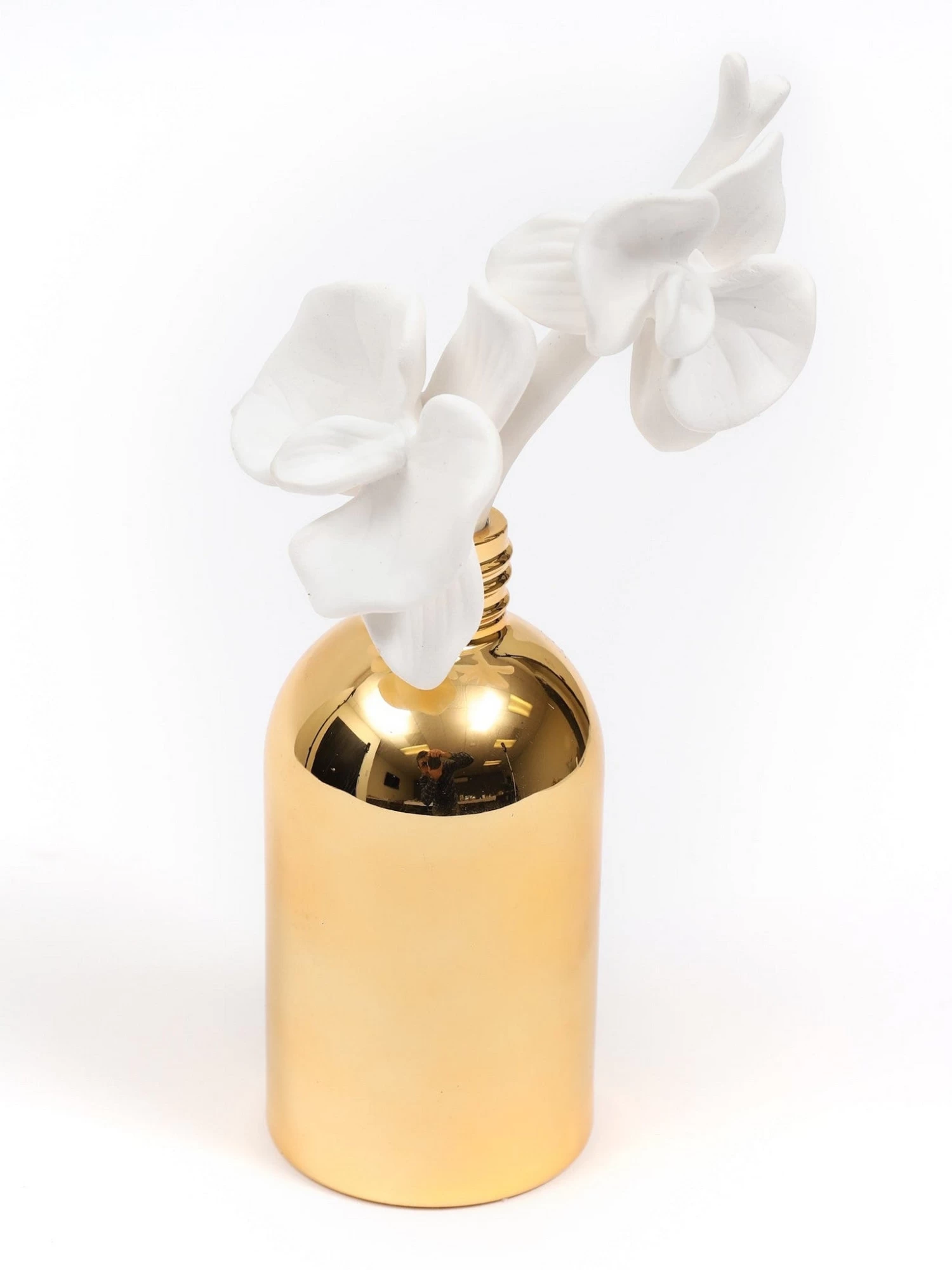 Description: This Gold Bottle comes with a White Flower Diffuser and 3 Black Reeds. This gorgeous diffuser will scent your room with a fruity fragrance of English Pears and Freesia. Create a wonderfully mellow environment with this elegant Diffuser. This “English Pears and Freesia” scent combines the freshness of sweet pears, wrapped in a bouquet of white freesias, imbuing a cool and calm spirit.