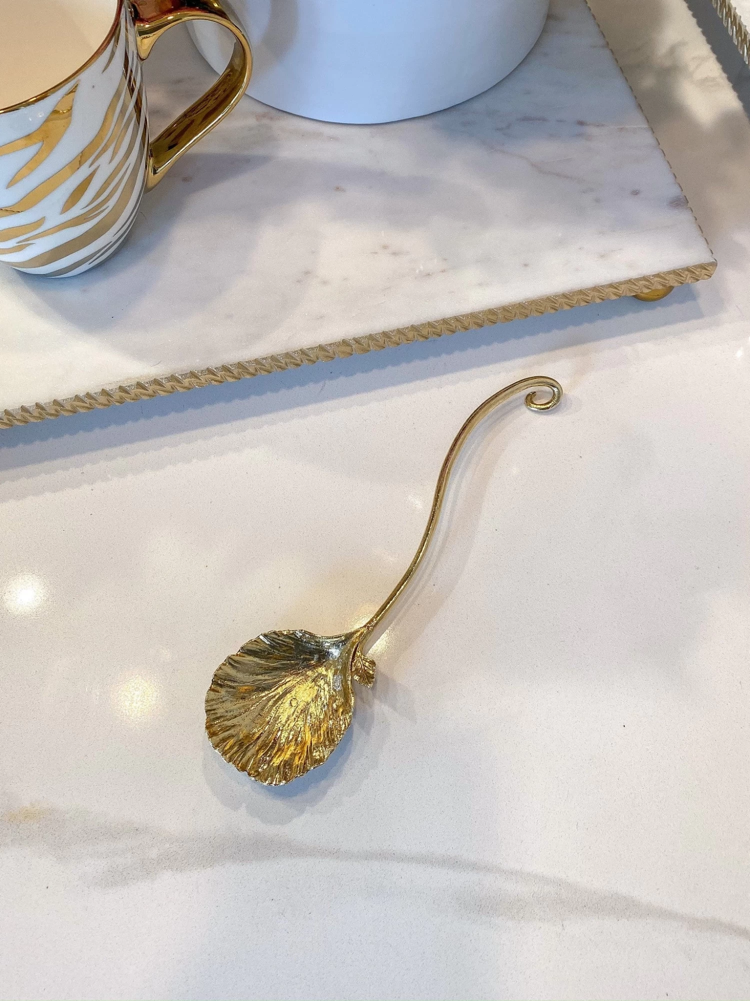 Description: Highlight any dish with this elegant spoon. This stylish organic spoon is plated in 24k gold, the end is designed as a flower petal with a small leaf poking out the side. The handle swirls upwards, making serving a dish stylish and easy!
