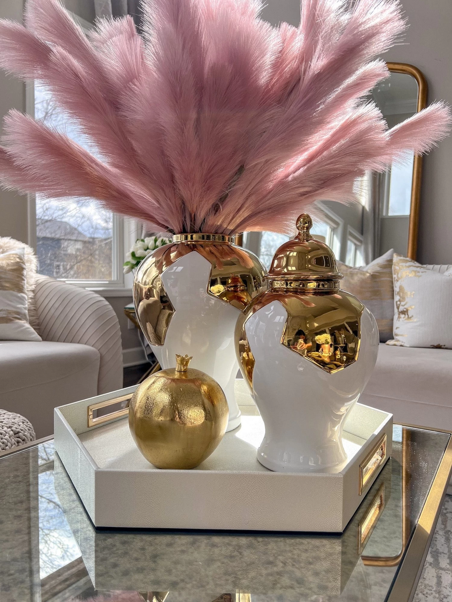 Description: These geometric white and gold ginger jars are a modern yet trendy way to decorate! Use them for your favorite faux florals or style them on their own!