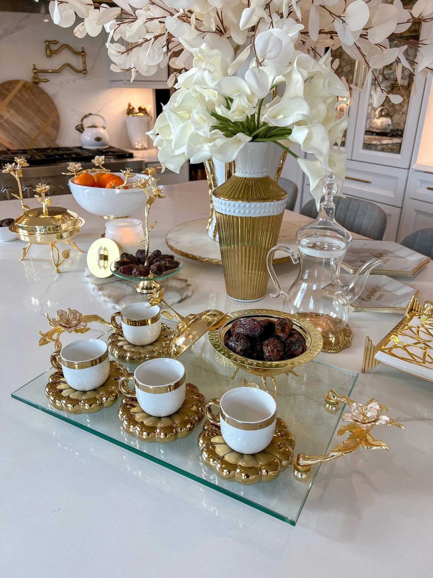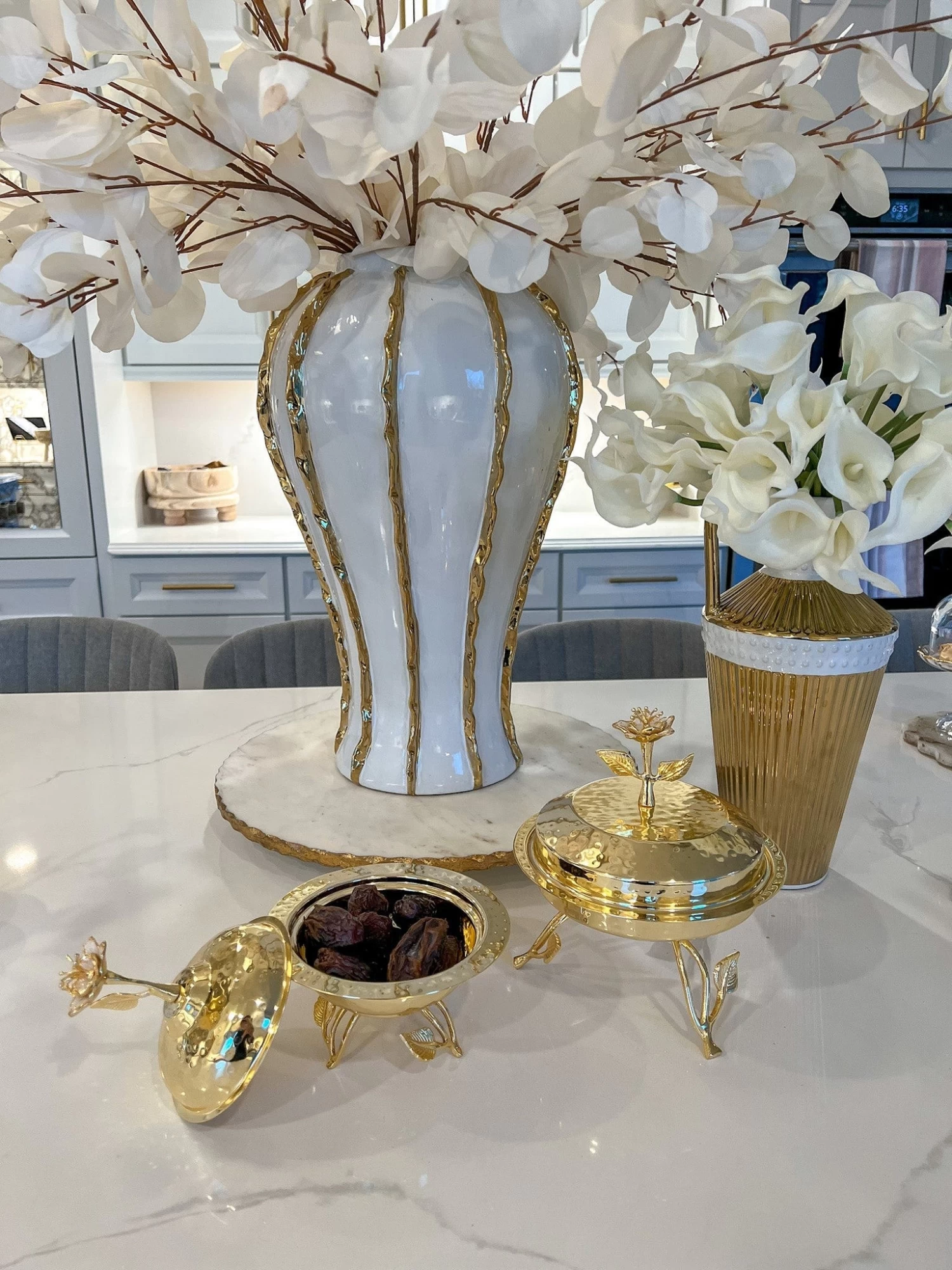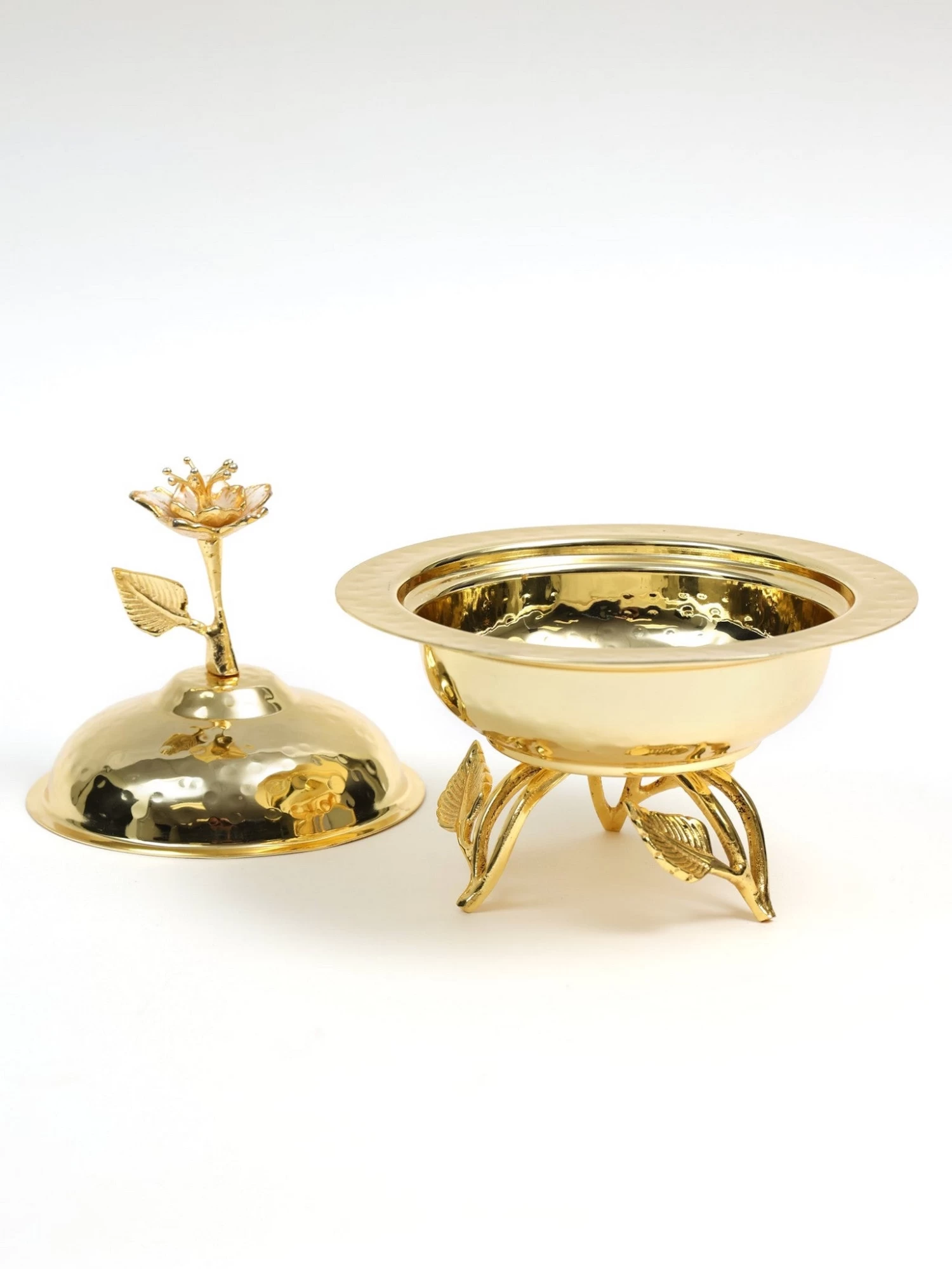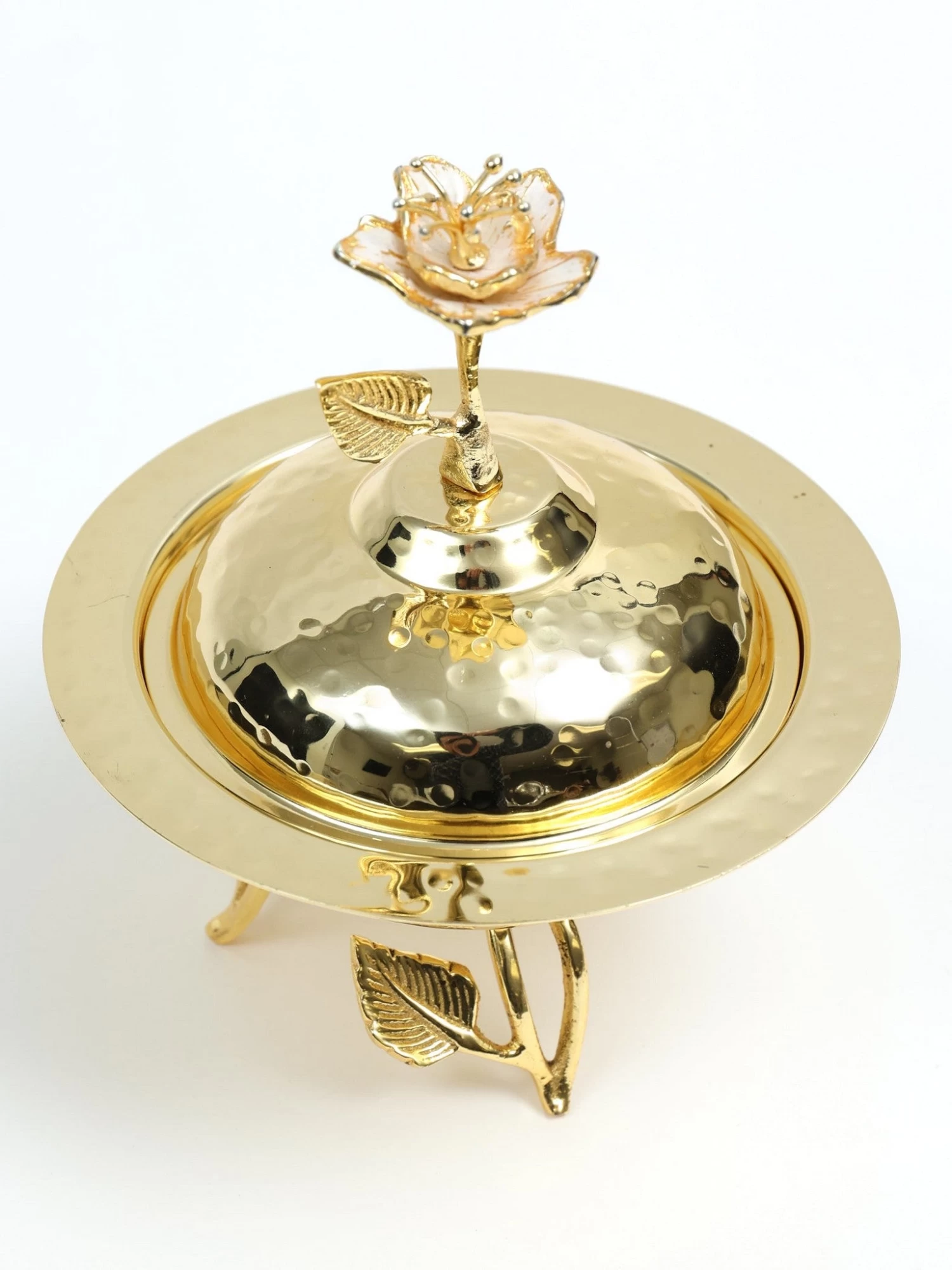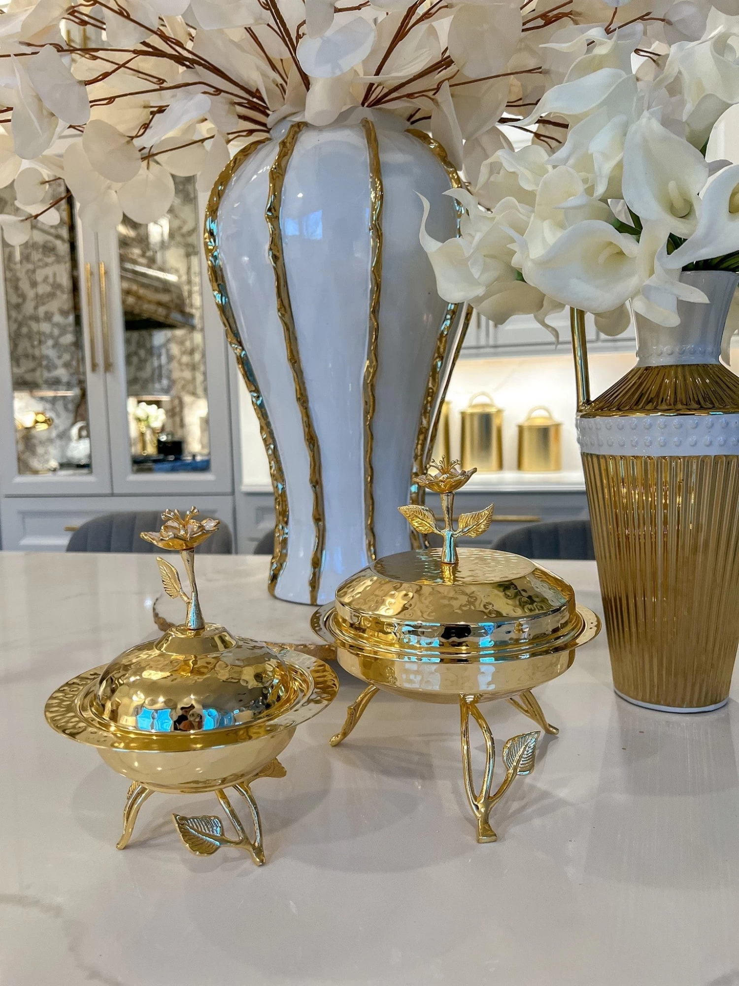 Description: This gold round dish has a cover and is intricately detailed with gold and white flowers. This dish is so versatile and can be used as a candy dish or for your favorite treats!