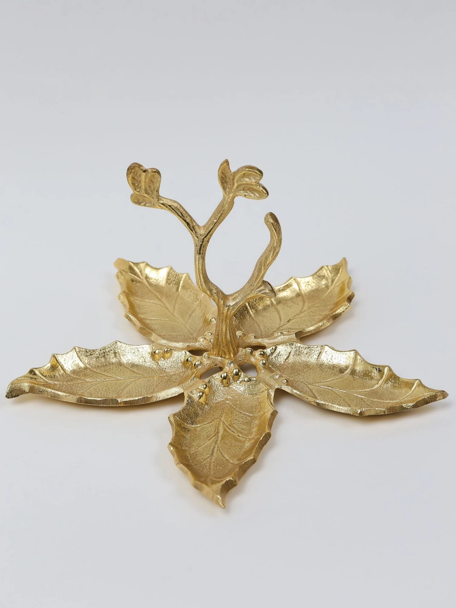 Description: This gold metallic leaf tray is perfect for the holiday season! The detailed leaves are accented with lovely little berries and a beautiful floral stem in the center. This gorgeous piece is perfect for holiday decor, or to serve your favorite snacks!