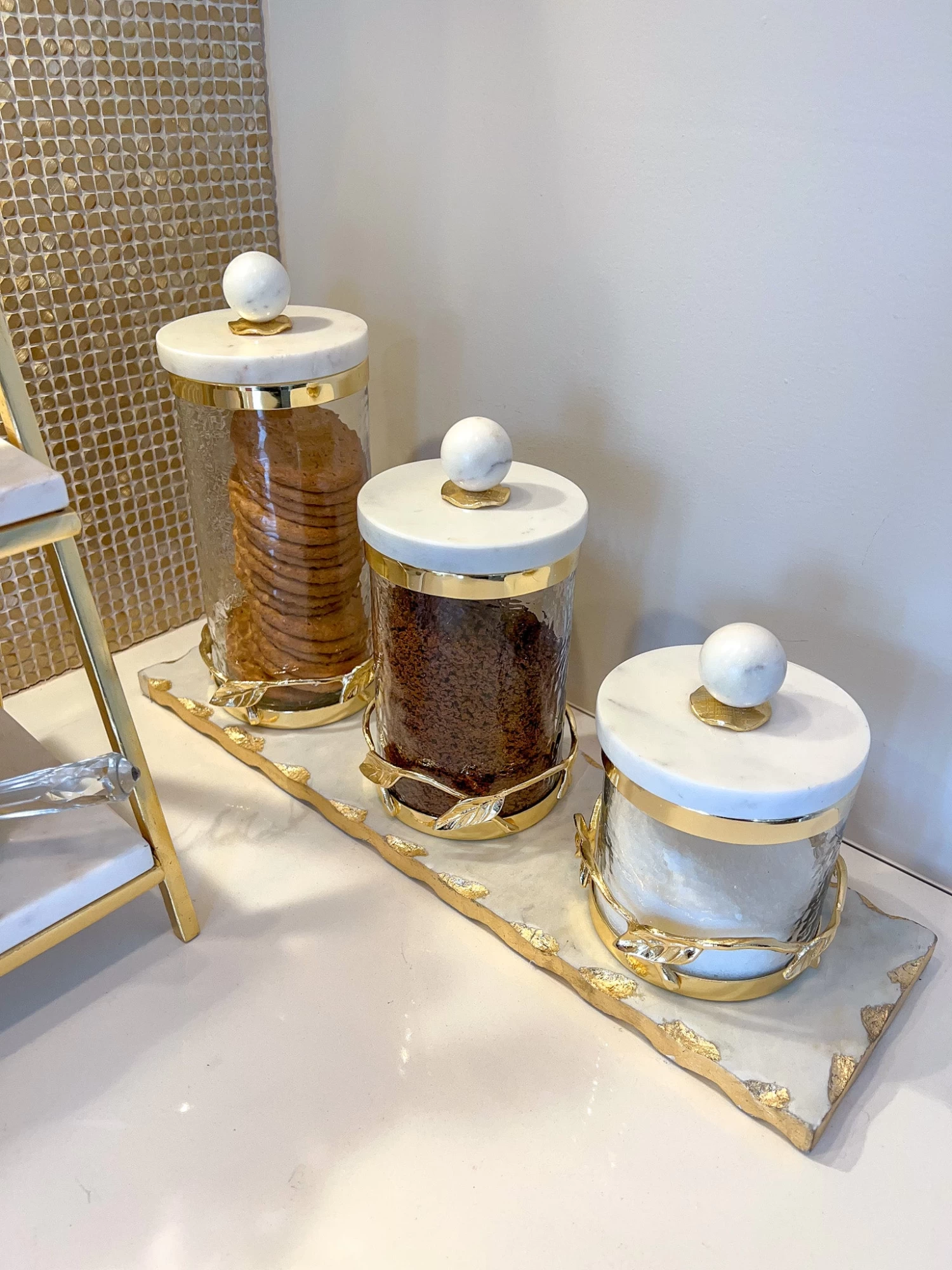 Description: This all-gold glass canister with a marble lid is a beautiful blend of styles! Use it at a coffee station in conjunction with our other two canisters for a glamorous coordinating display.