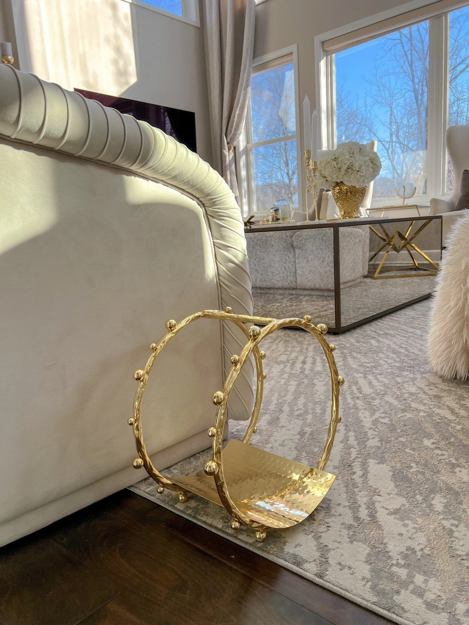 Description: This stunning circular studded design gold rach can store your magazines, newspapers, records, artwork, and more in a stylish manner.