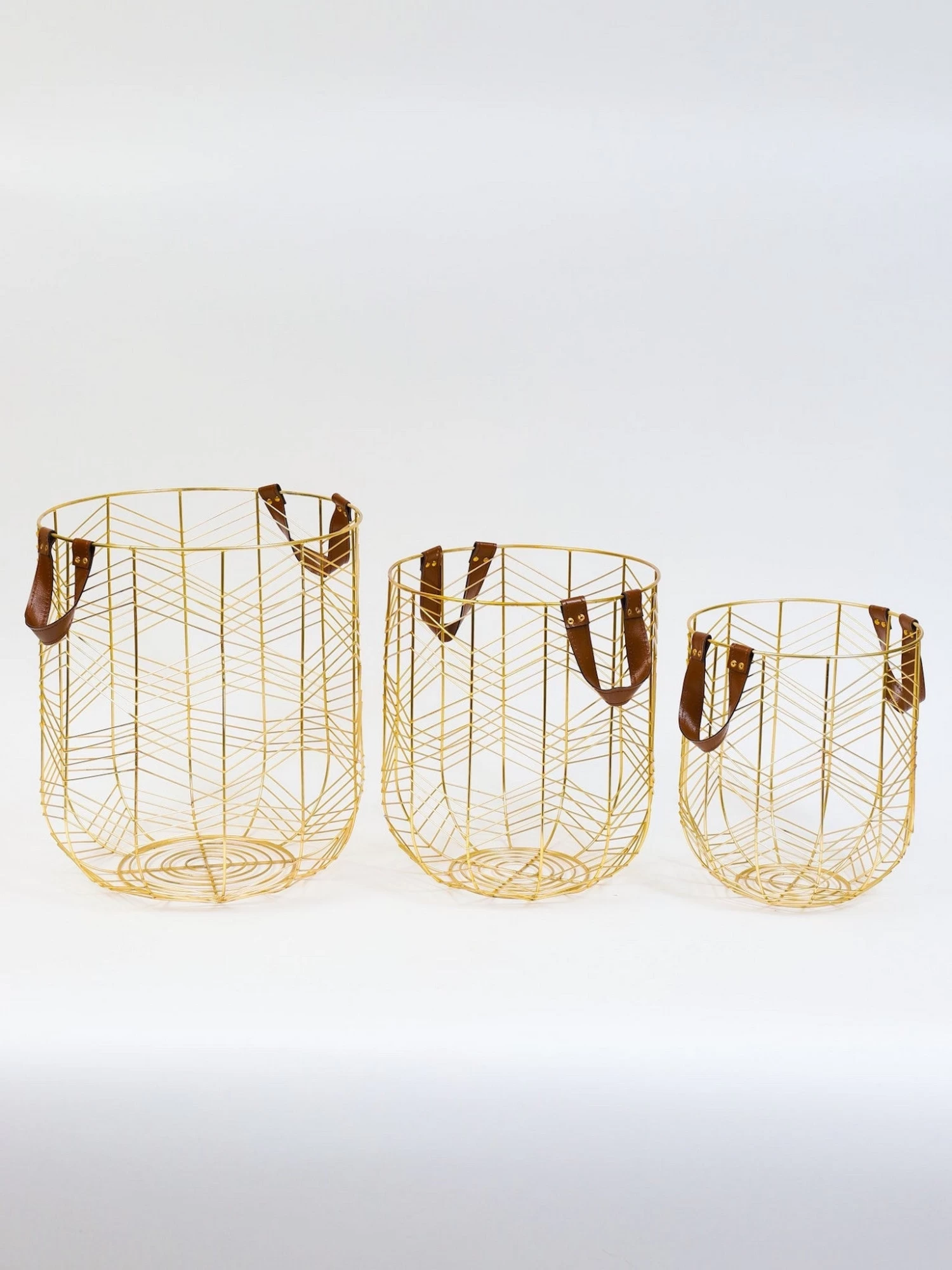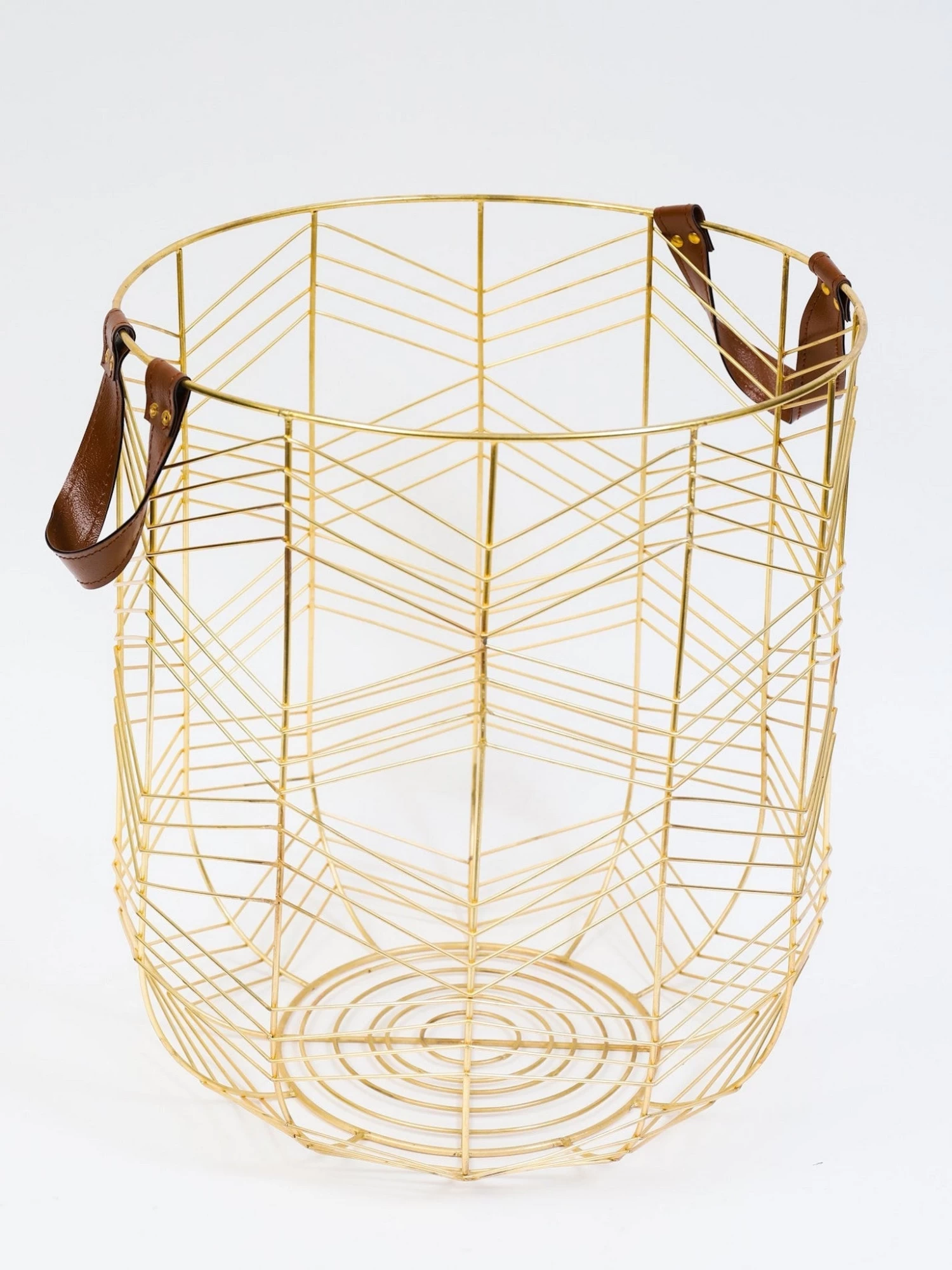 Description: Keep your space tidy and neat with the help of these gold metal storage baskets. The gold zig-zag pattern with faux leather handles will look great in any space for additional storage to hold your pillows, blankets, toys or magazines.