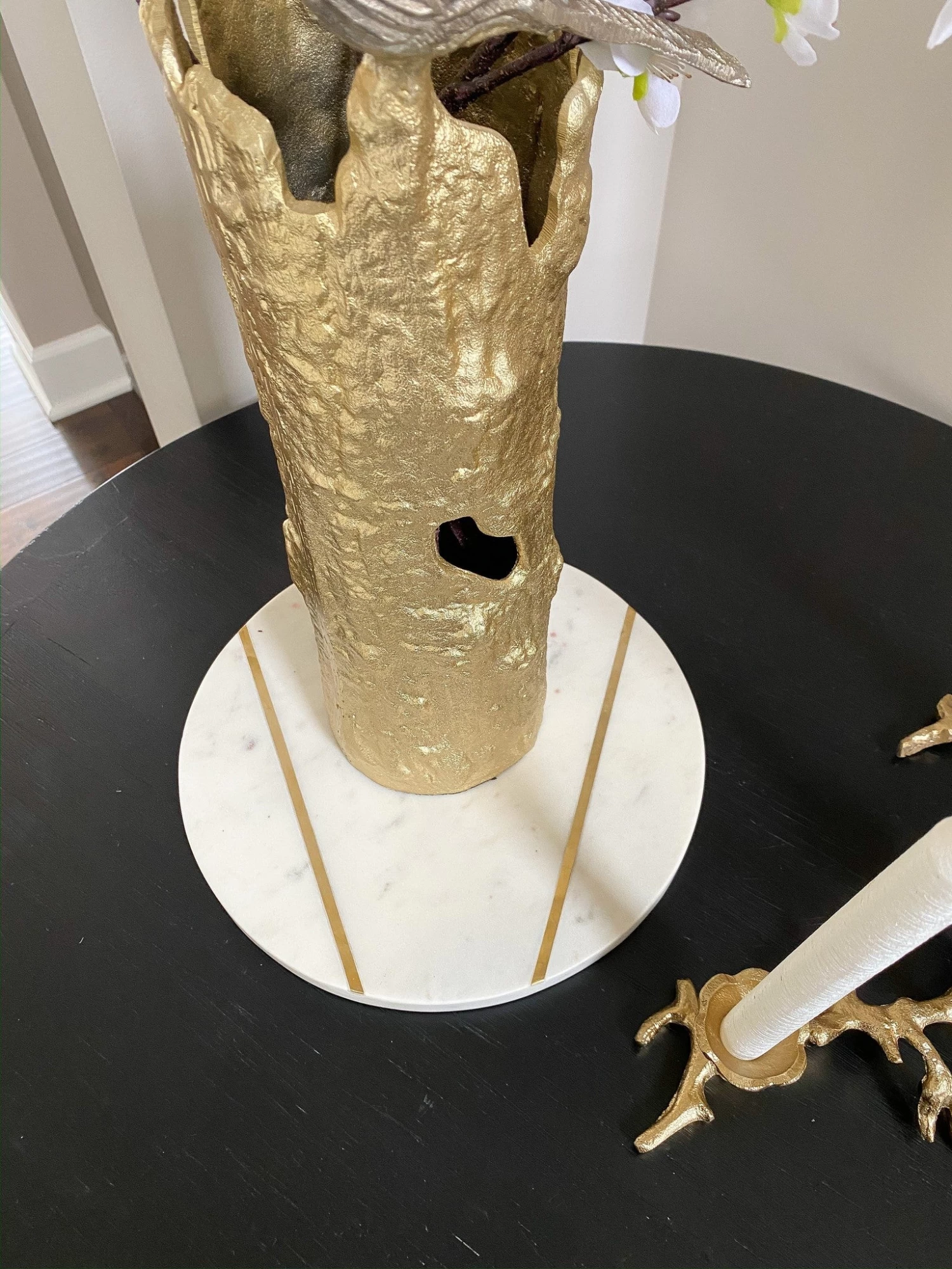 Description: This gold metal “tree” vase features a bark-like gold finish and a small silver bird. It is a great way to introduce some nature into your decor!