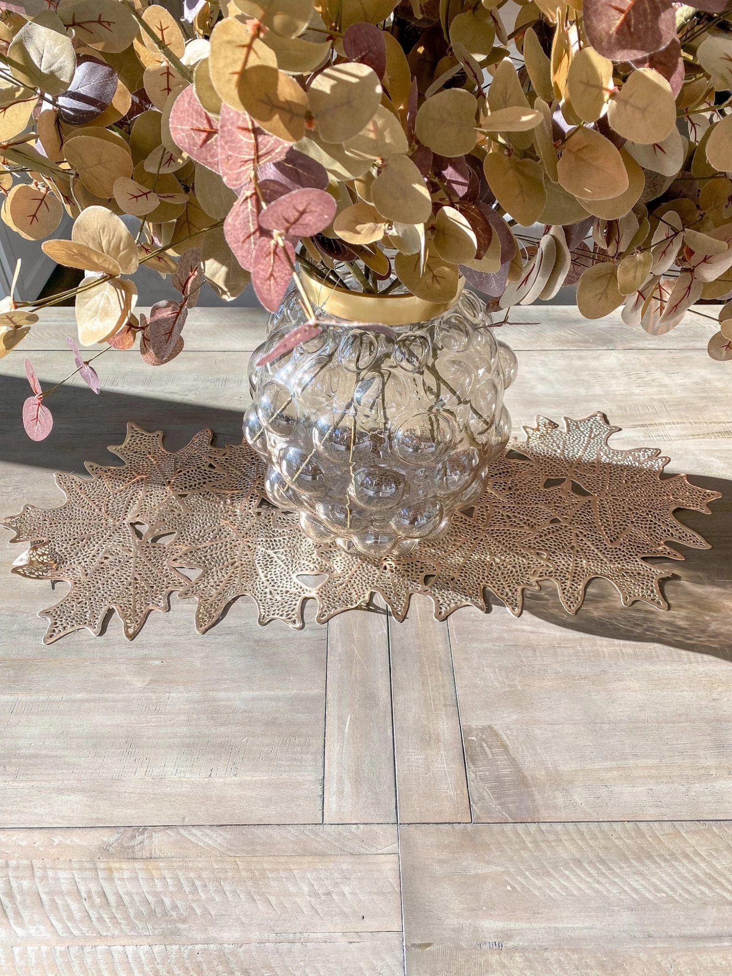 Description: This stunning table runner is perfect for all your fall gatherings! The gold metallic finish offers a glamorous design and the openwork maple leaves make this feel warm and perfect for the season!