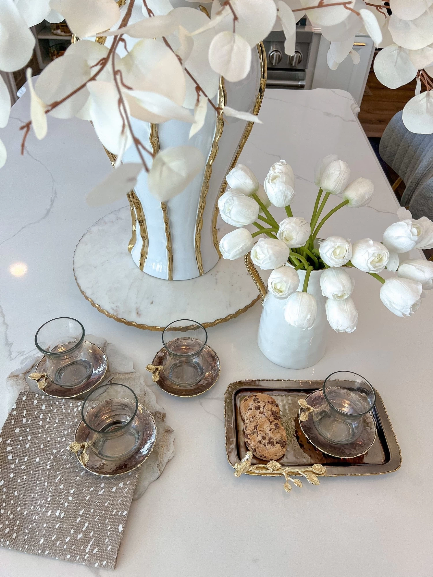 Description: Make a stunning impression at your next gathering with this golden, metallic serving platter! The leaf and flower design is sure to turn heads and is perfect for laying out snacks. This tray could also be used as a layering piece for candles.