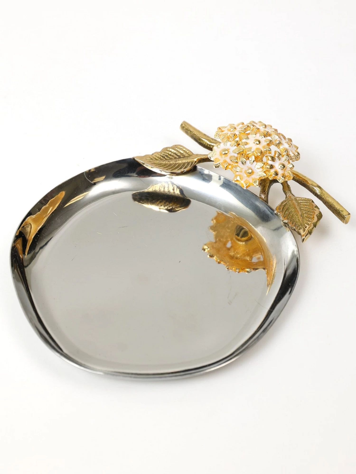 Description: Add a glamorous statement to your home with this shimmering trivet from the Hydrangea Collection. Its gold and silver radiance lend a bold yet elegant touch to any setting, serving as a trivet, coaster, spoon rest, or decorative accent. A unique addition to your home, the glitz and glam of this piece will be sure to impress.