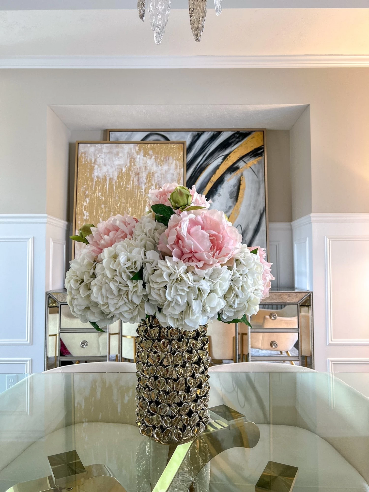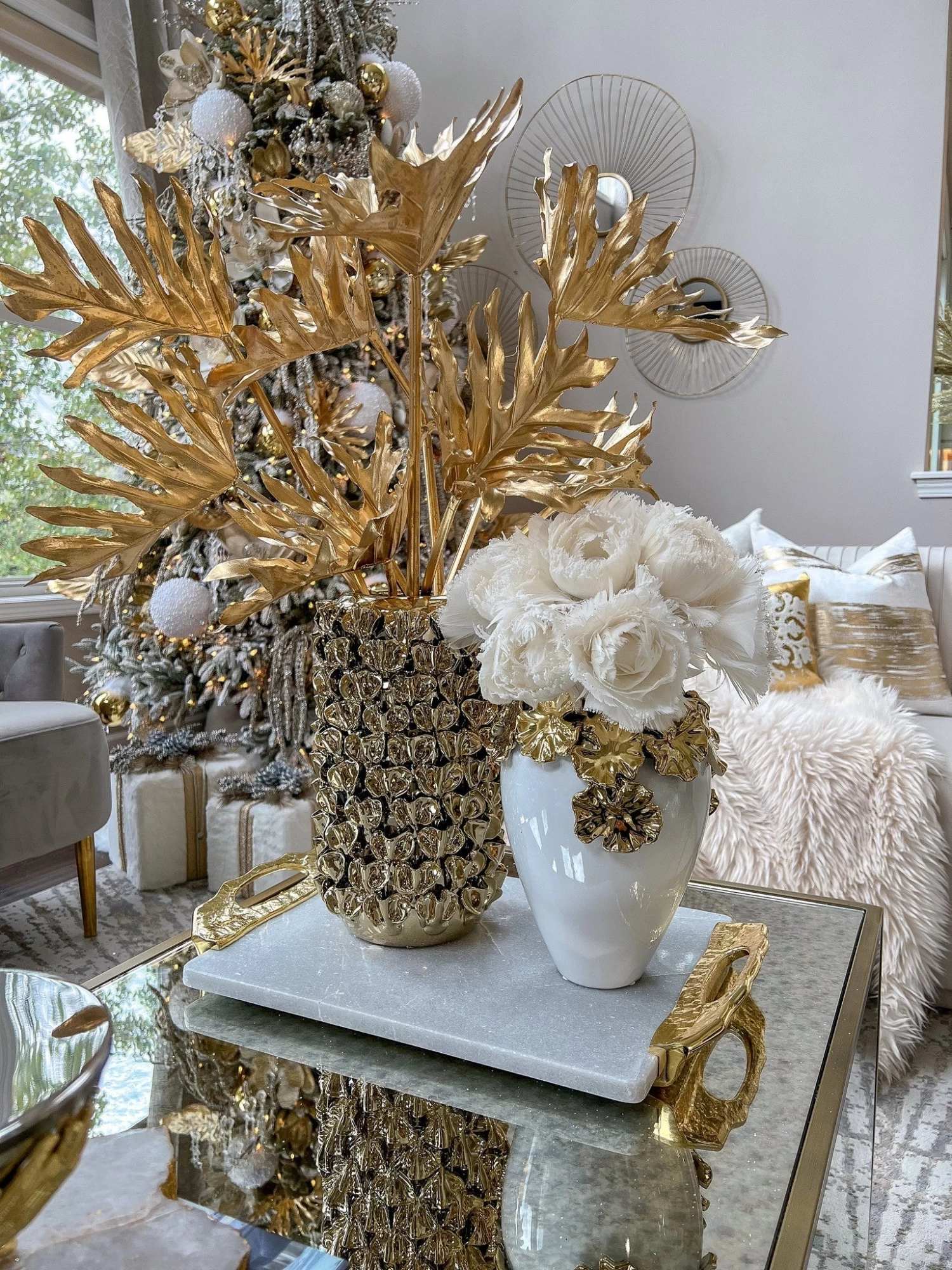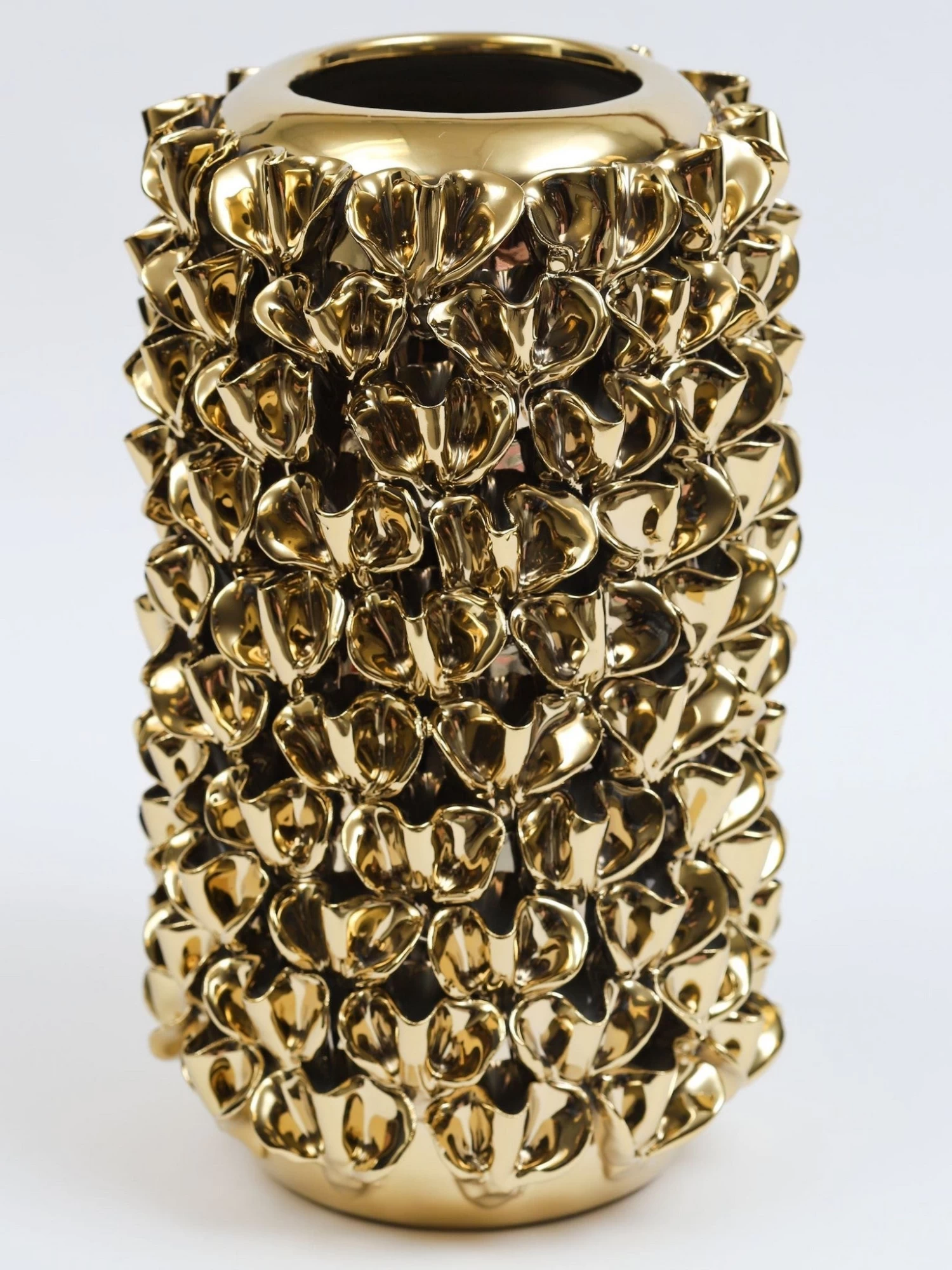 Description: This substantial gold vase is a very unique piece to add to your home decor. The decorative floral petal detailing makes this vase a must have piece!