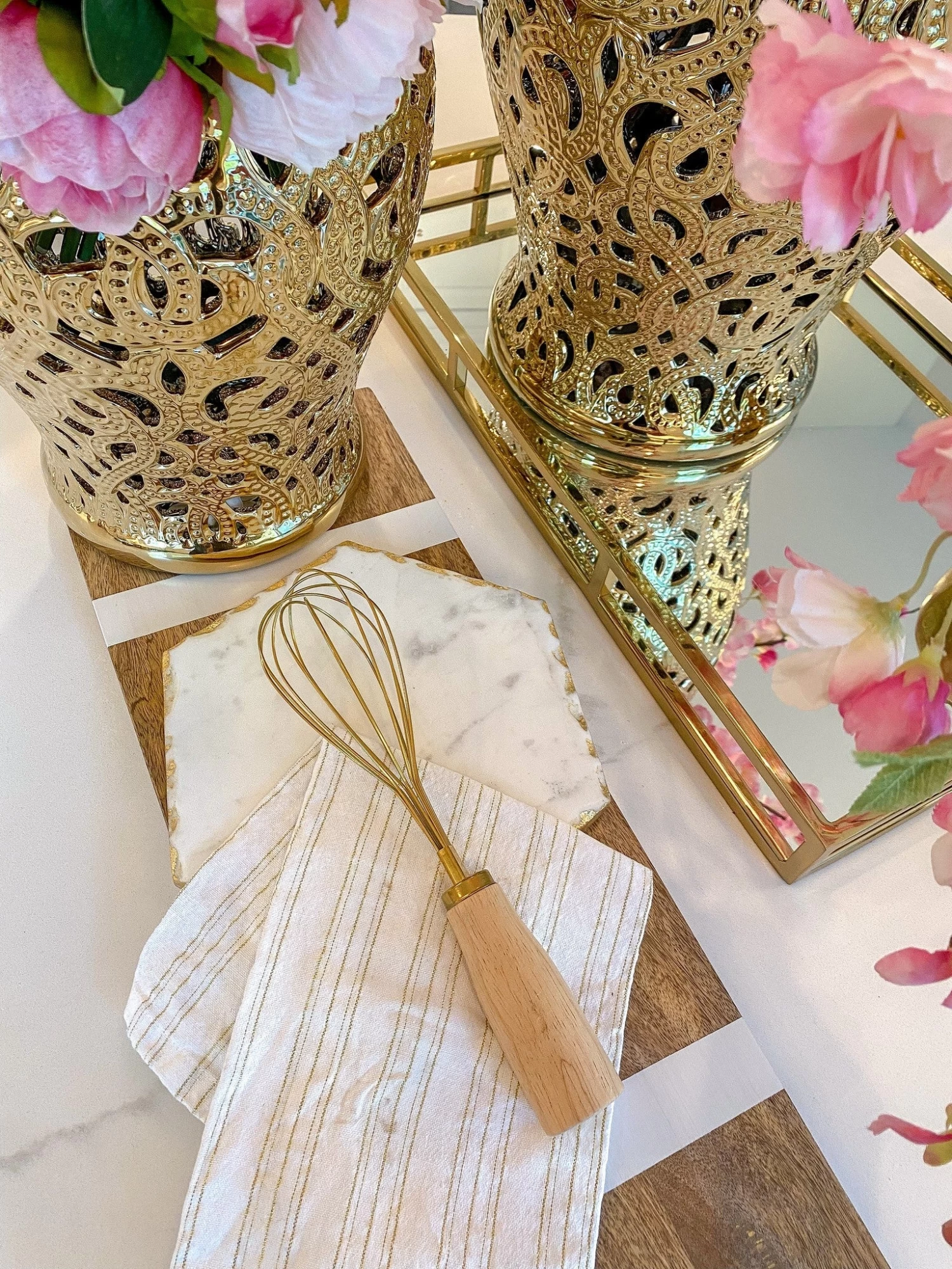 Description: This beautiful gold whisk is the perfect baking accessory!! The wood handle is easy to grip, and adds to the elegant design of the utensil.