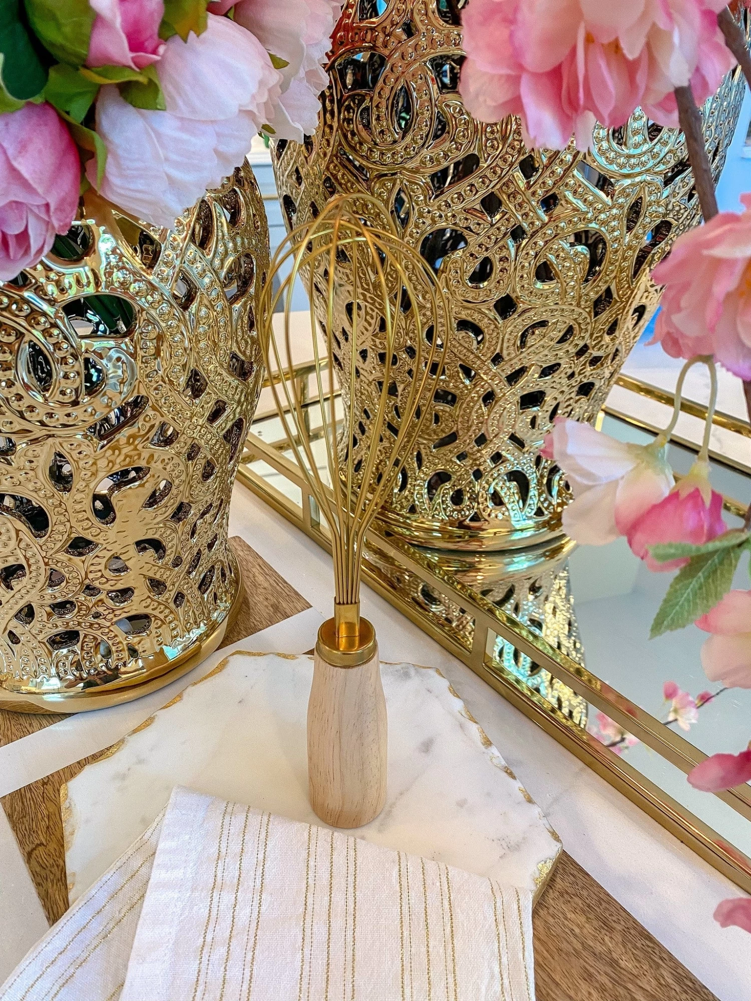Description: This beautiful gold whisk is the perfect baking accessory!! The wood handle is easy to grip, and adds to the elegant design of the utensil.