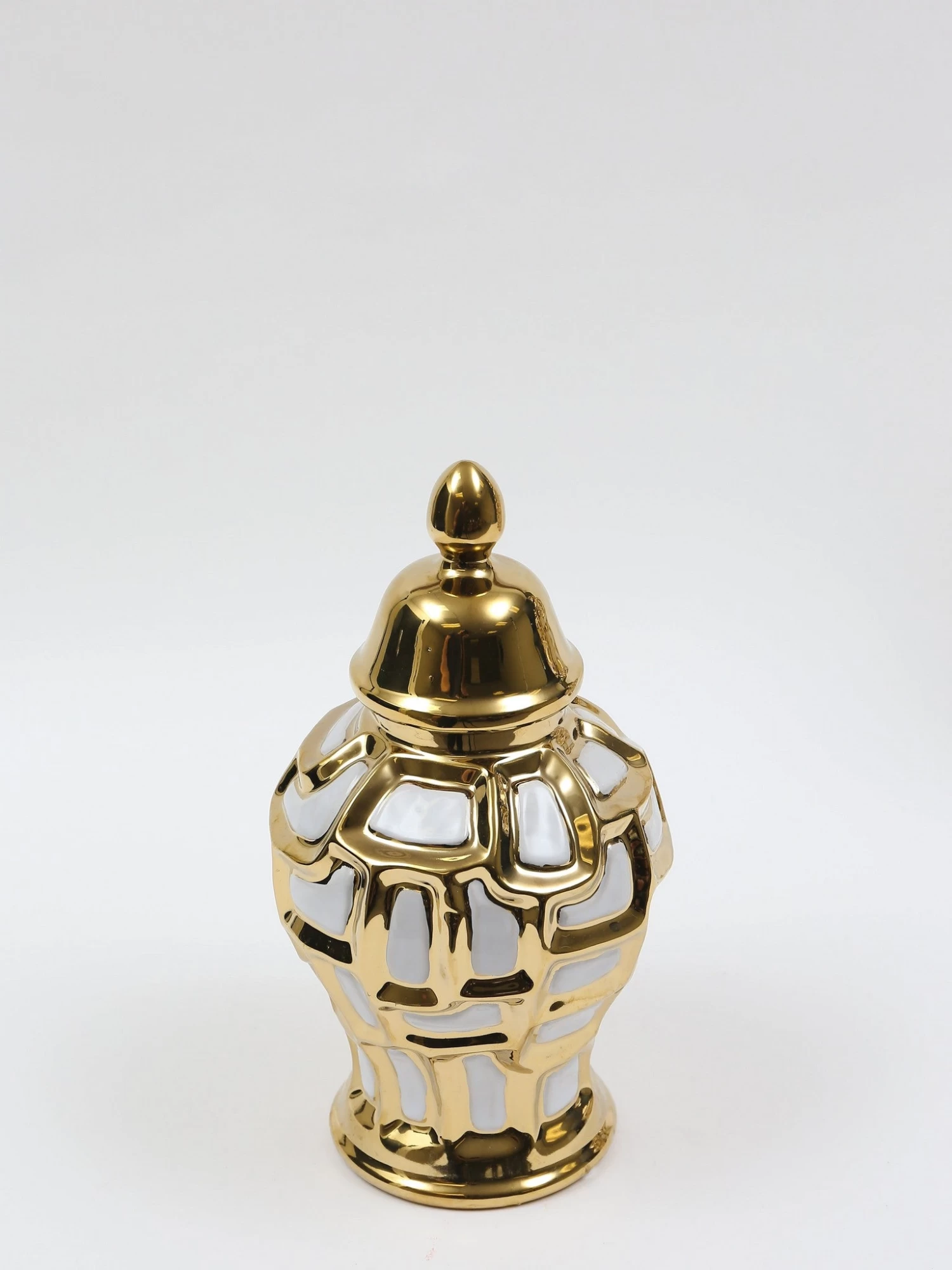 Description: Check out this white and gold Ginger Jar! This new style is a must-have! The white with geometrical dimensional gold detail is a timeless, statement piece! Use these Ginger Jars for your new focal point in your room! Available in 3 sizes.