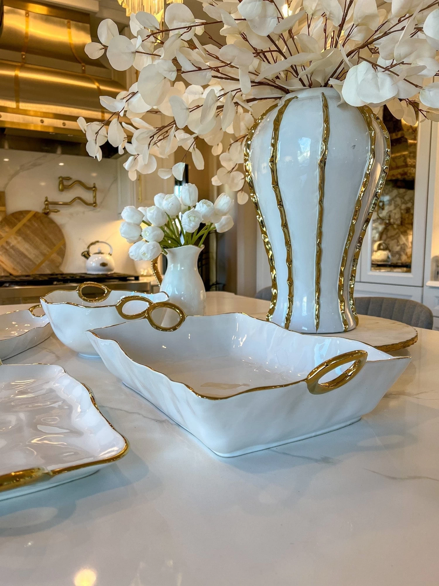 Description:ย The warm gold finished handles and edges accent gleaming white porcelain bodies. A new look which coordinates beautifully with traditional or contemporary table settings. These pieces are sure to add vibrant color to modern tables and fresh energy to traditional settings. Food safe, dishwasher safe, freezer to oven to table.