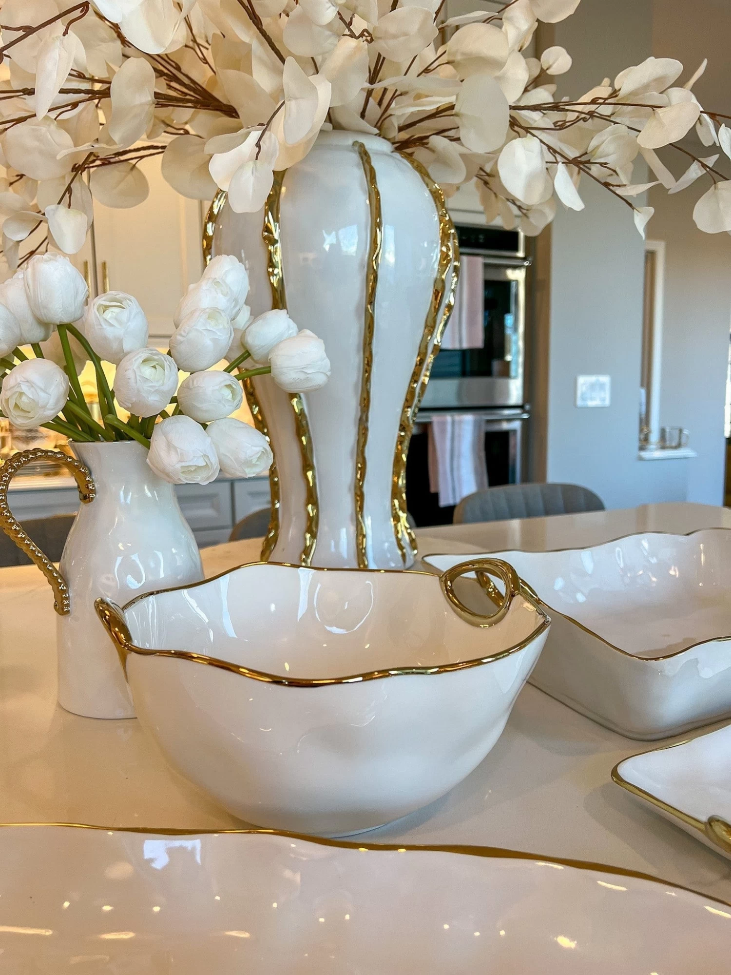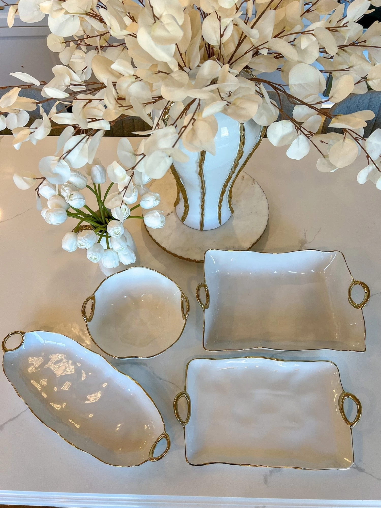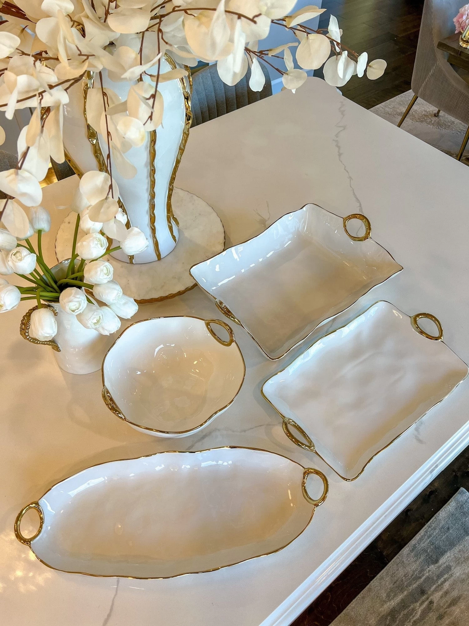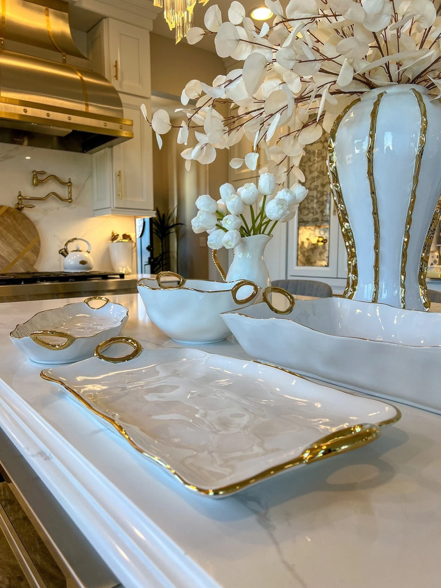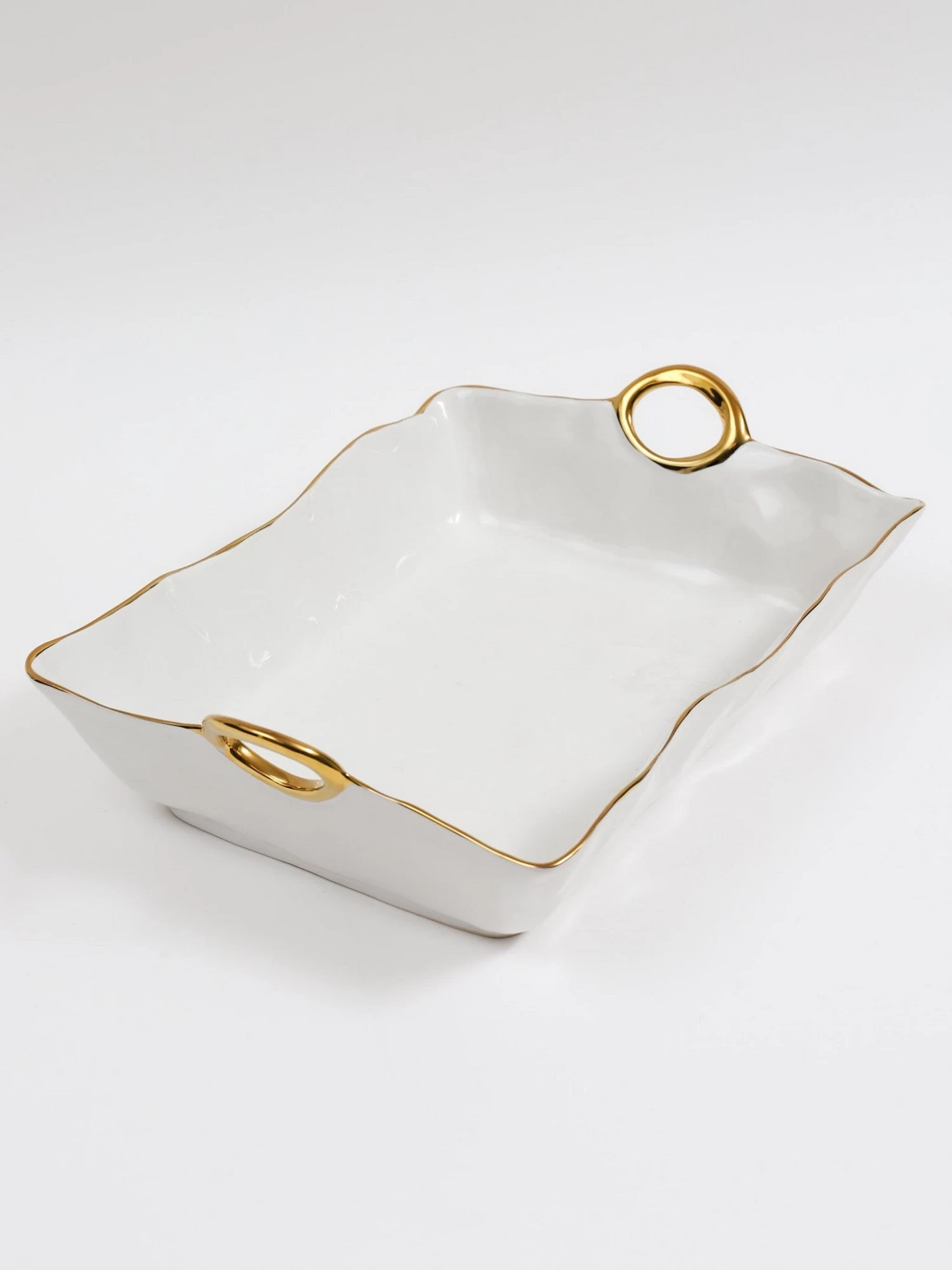 Description:Â The warm gold finished handles and edges accent gleaming white porcelain bodies. A new look which coordinates beautifully with traditional or contemporary table settings. These pieces are sure to add vibrant color to modern tables and fresh energy to traditional settings. Food safe, dishwasher safe, freezer to oven to table.