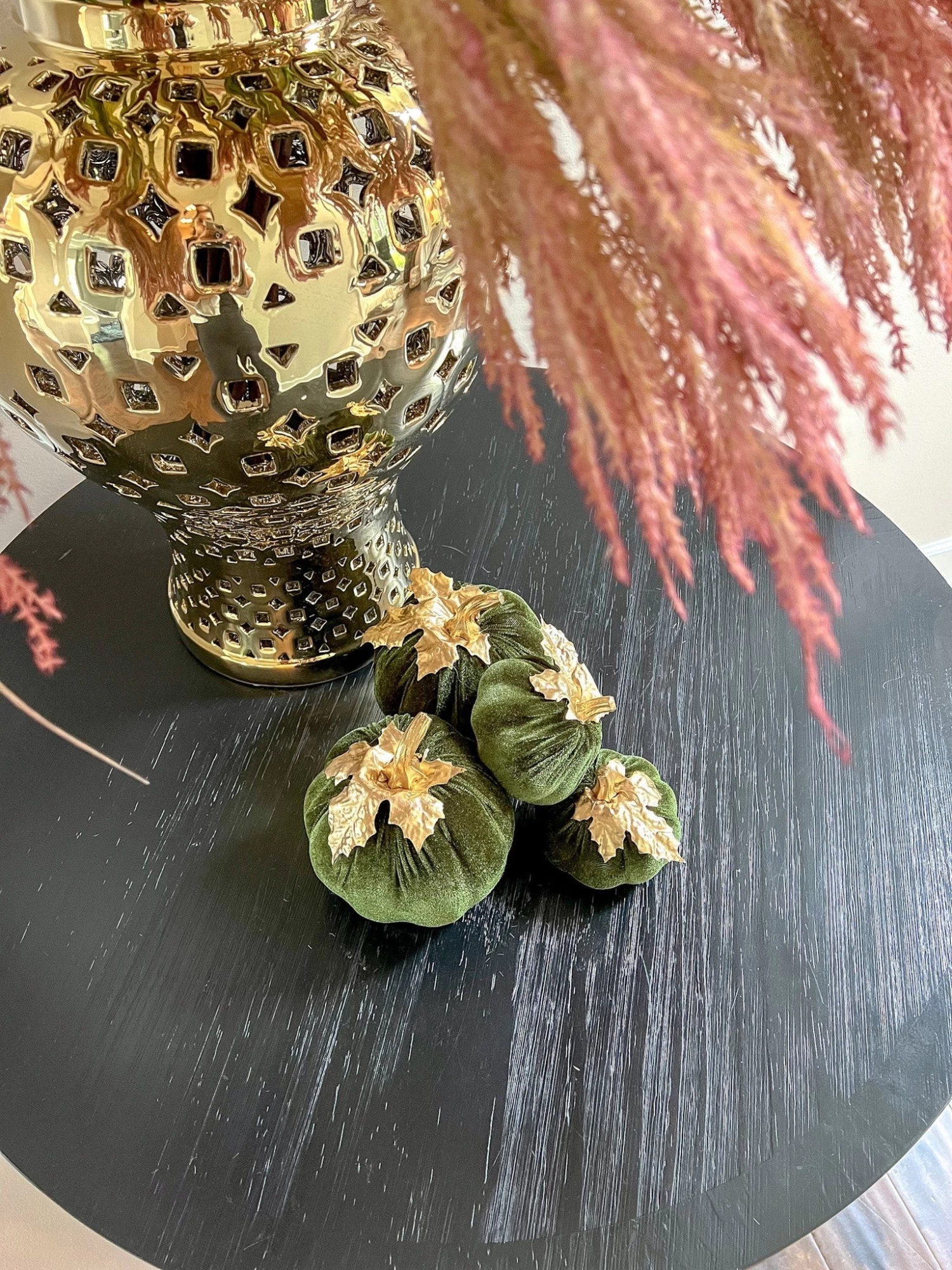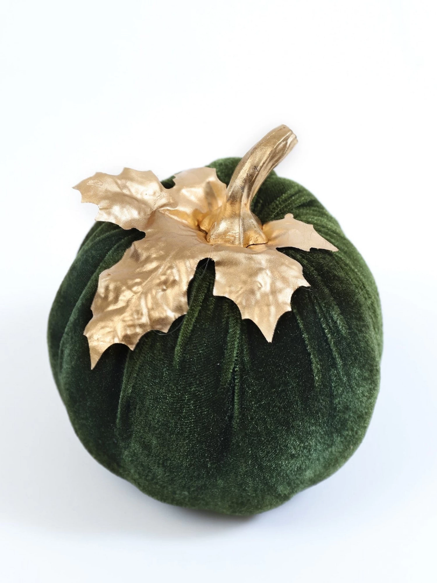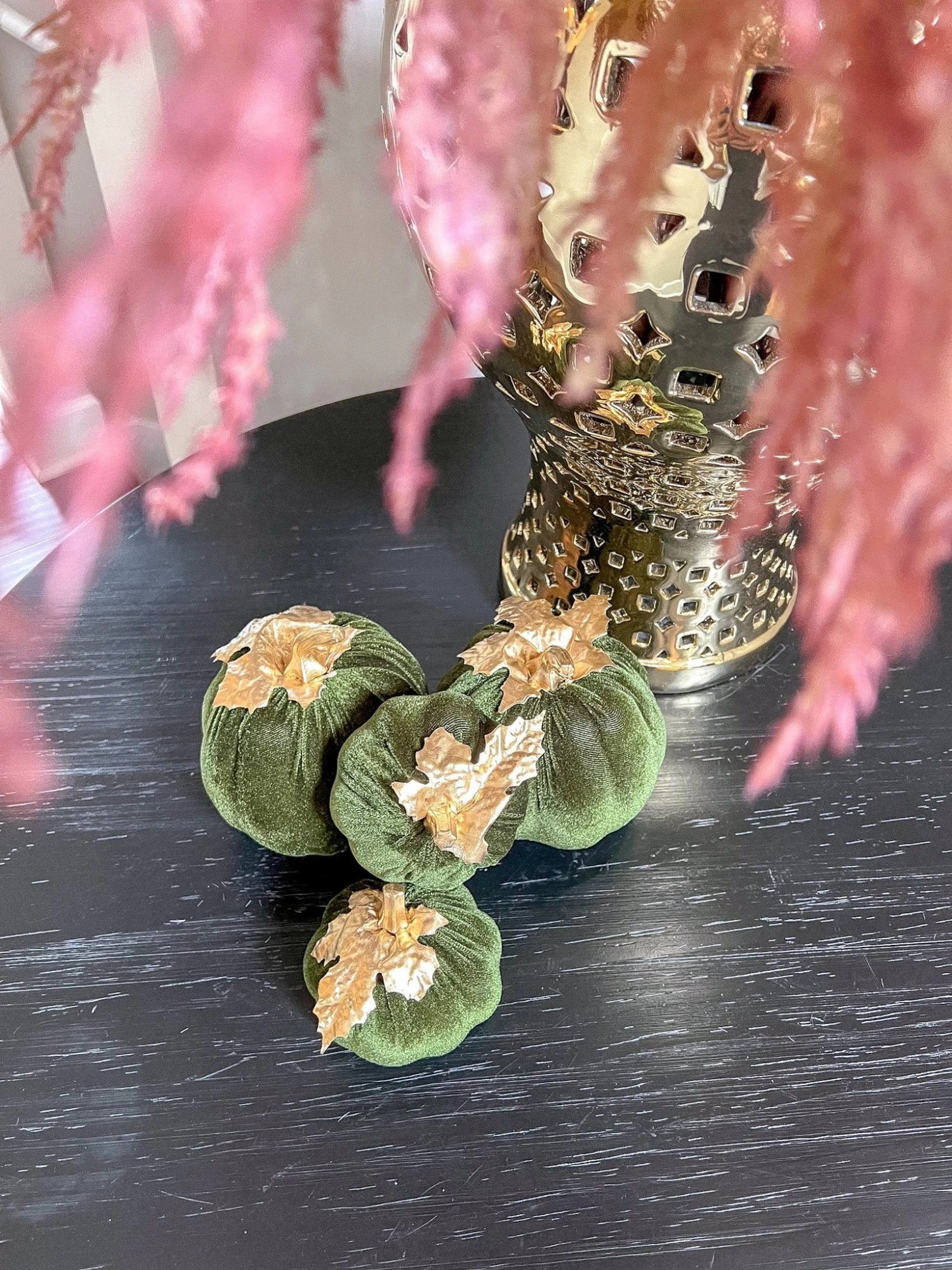Description: This green velvet pumpkin has a gold stem and leaf and will look great with your fall decor!