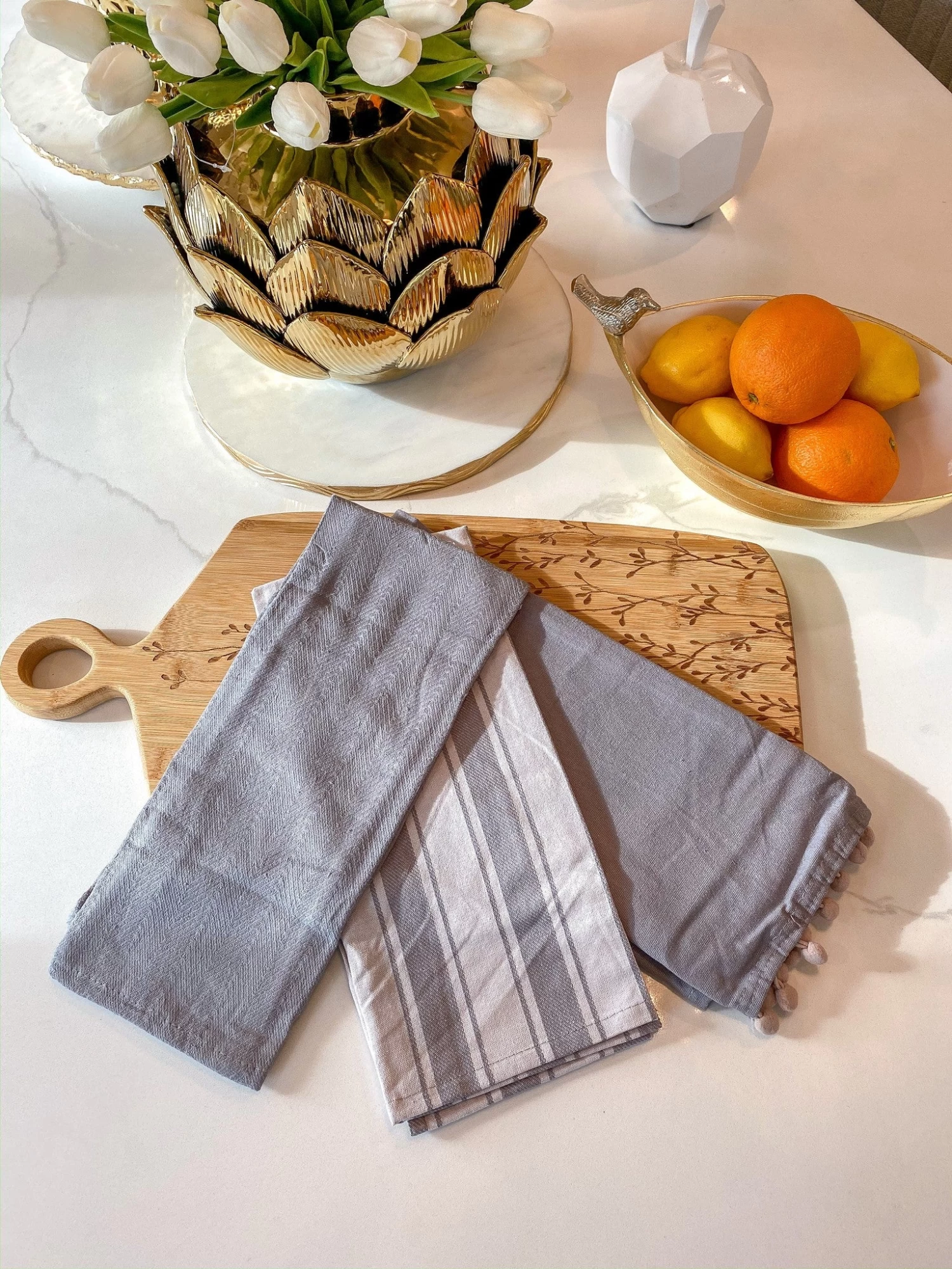 Description: This set of 3 grey dish towels are a nice addition to any kitchen. They are very soft and one even features small pom poms on the bottom.