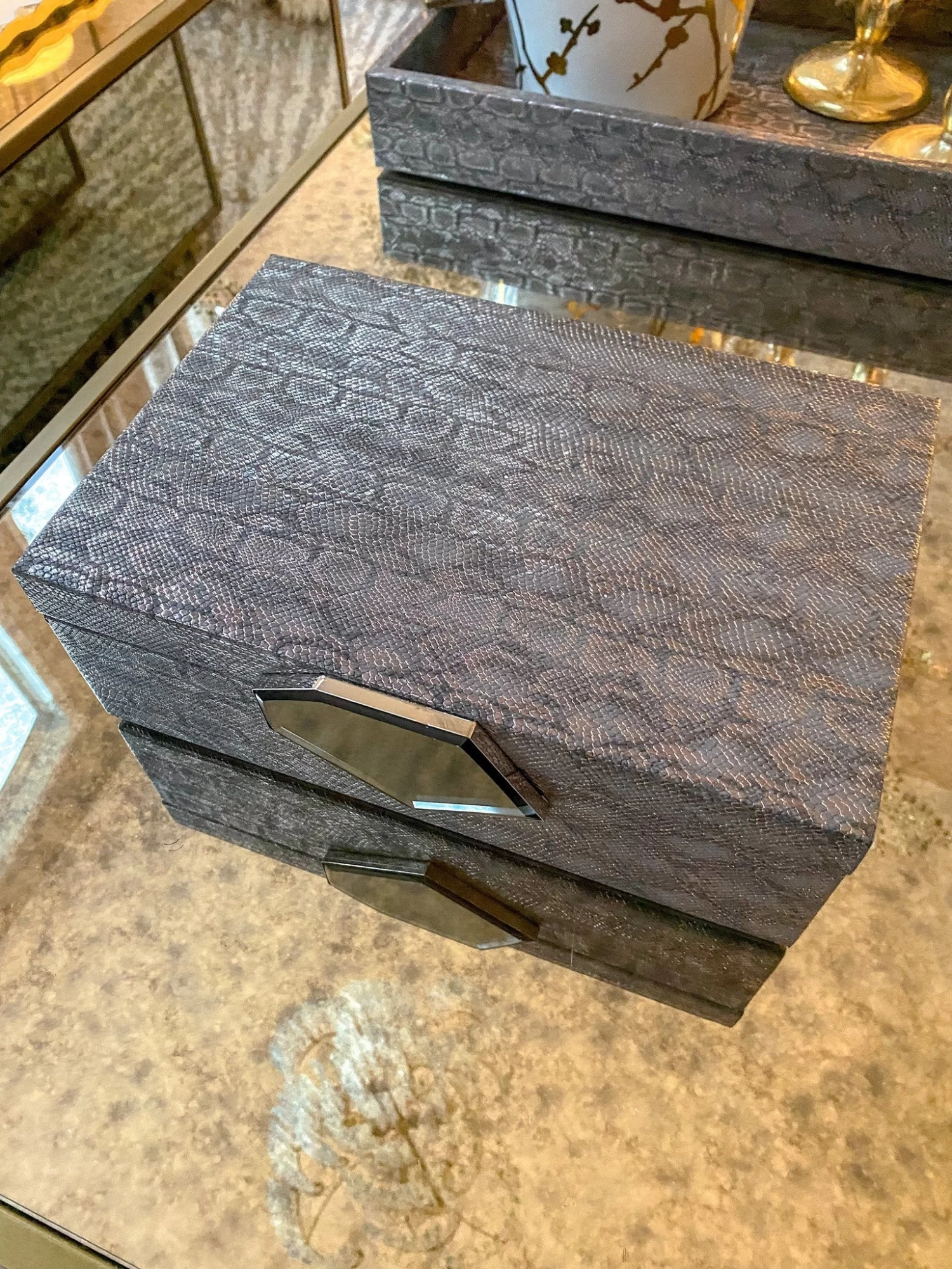 Description: This dazzling decorative box offers a unique and modern design style! We love the bold abstract medallion on the front, complimented with the faux grey leather finish!