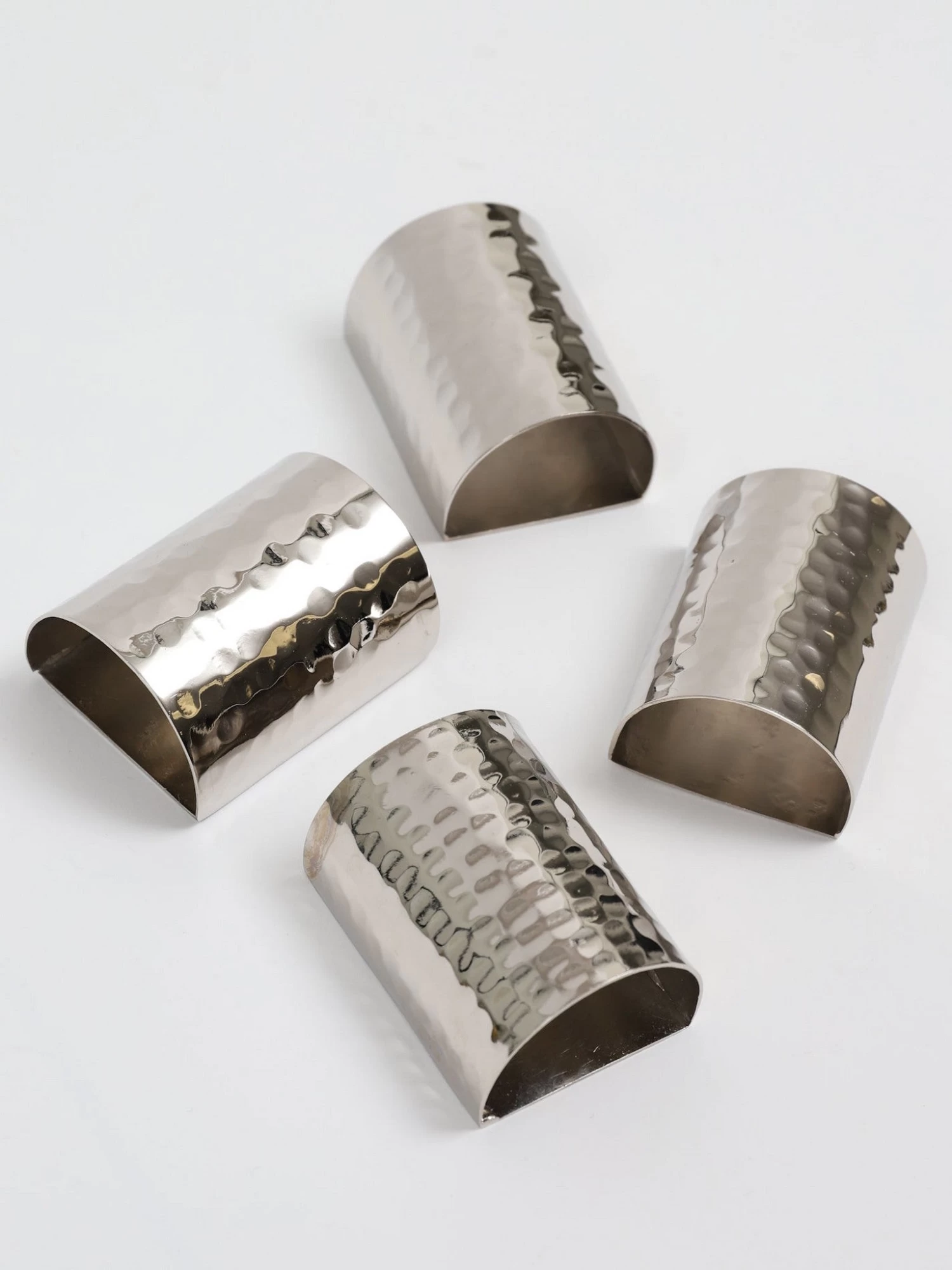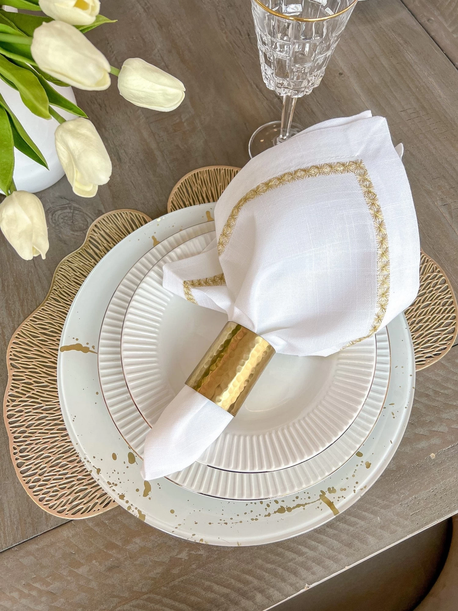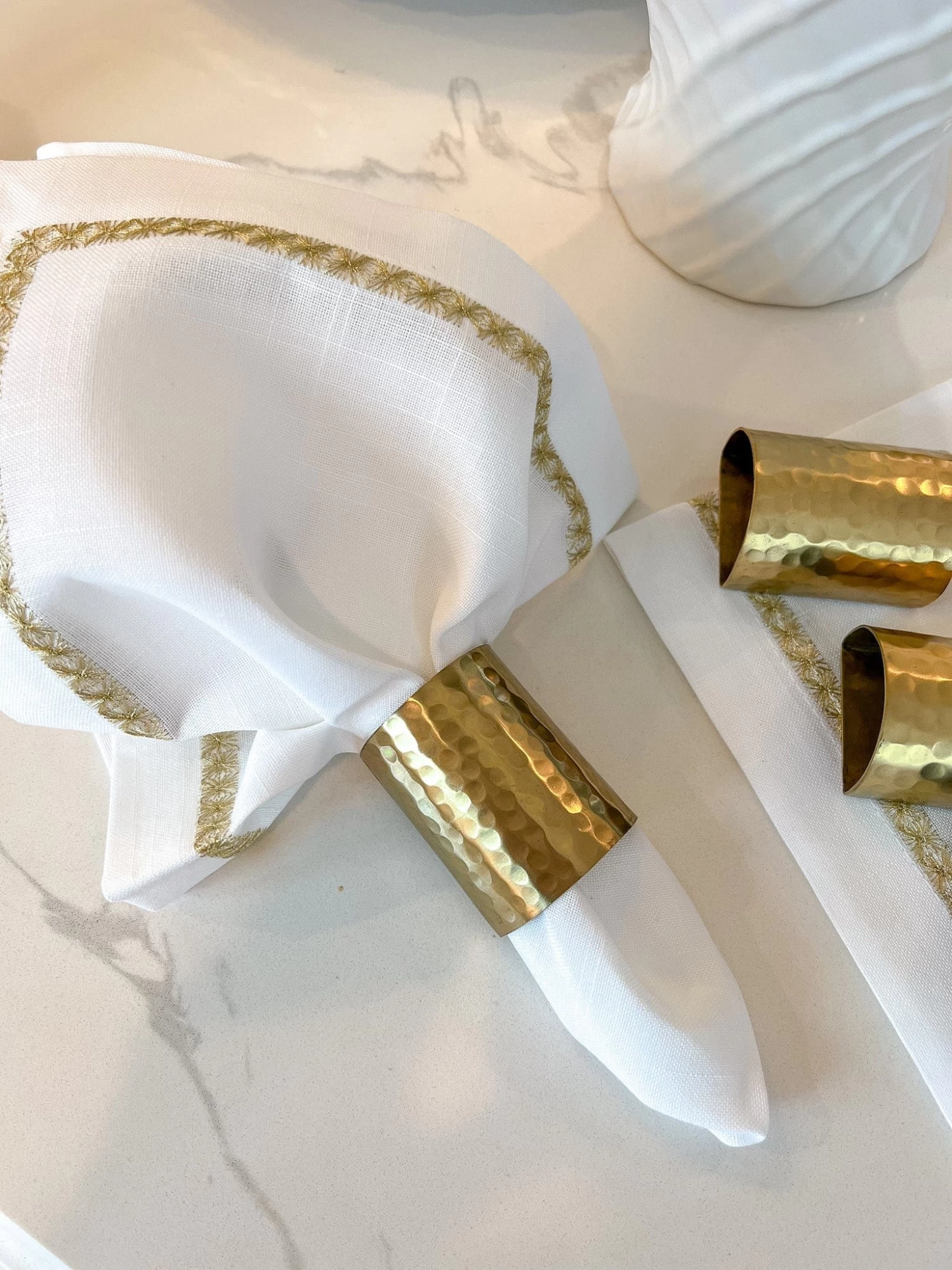 Description: The hammered metal napkin rings will look gorgeous with our white and gold embroidered napkins!