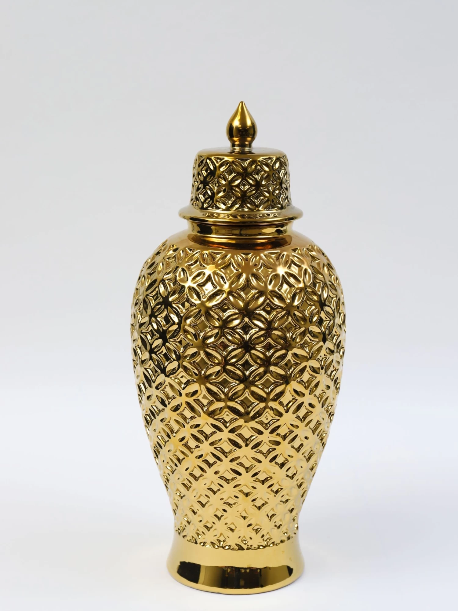 Description: These gold lattice design ginger jars are an easy way to add a unique elegance to your home decor! This design will look beautiful styled with your favorite flowers, or on its own!